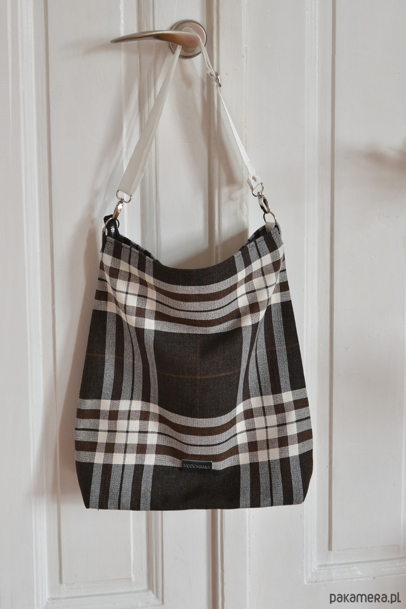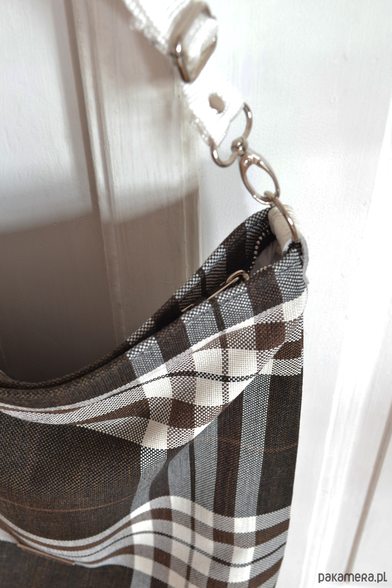 Torba na ramię wykonana z tkaniny bawełnianej w odcieniach bieli i czekolady.