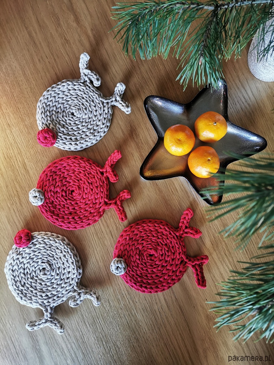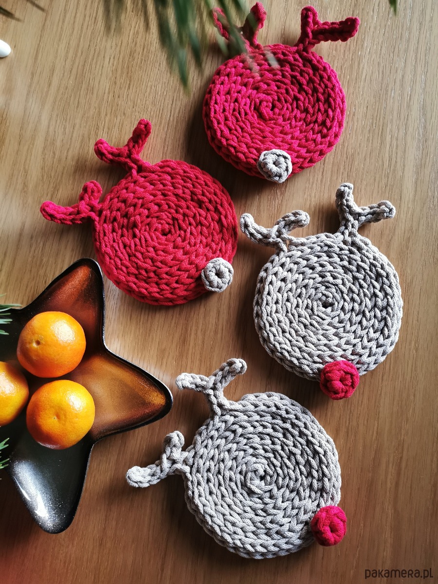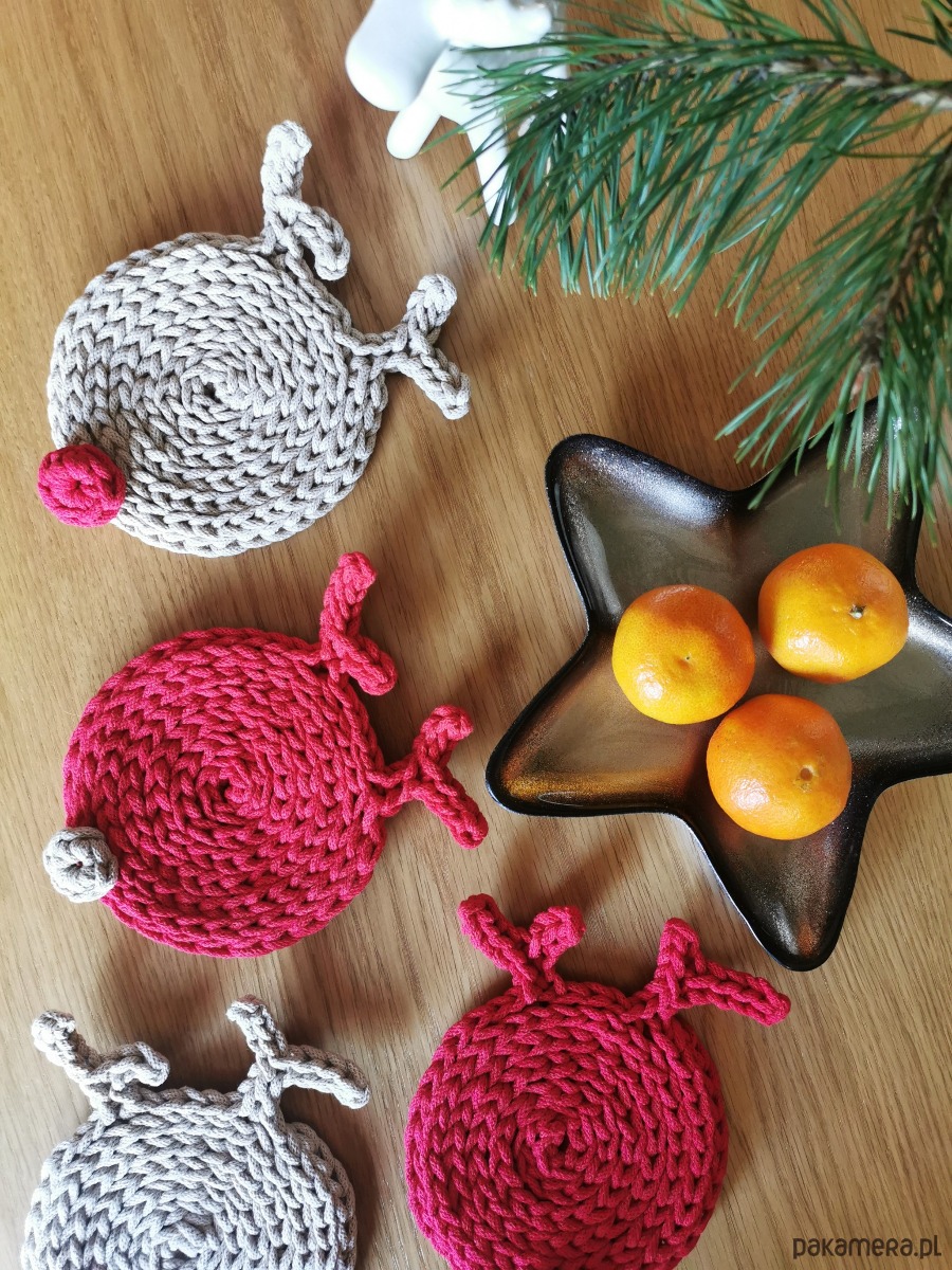 Wprowadź do swojego domu odrobinę świątecznej magii dzięki uroczym podkładkom pod kubek w kształcie renifera. Każdy renifer jest starannie wykonany z miękkiego bawełnianego sznurka, dzięki czemu nie tylko pięknie zdobi świąteczny stół, ale też doskonale chroni jego powierzchnię przed gorącymi kubkami, szklankami i zimowymi napojami.