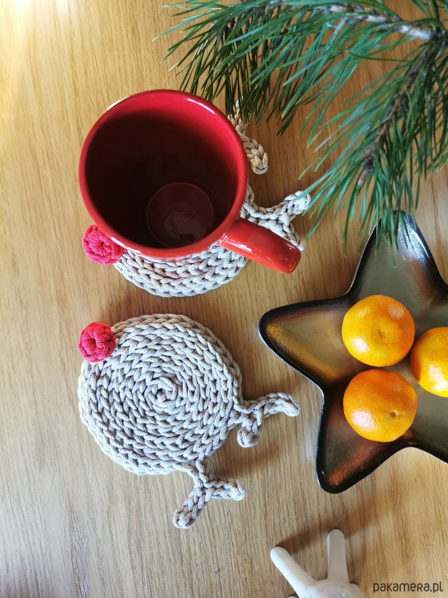 Wprowadź do swojego domu odrobinę świątecznej magii dzięki uroczym podkładkom pod kubek w kształcie renifera. Każdy renifer jest starannie wykonany z miękkiego bawełnianego sznurka, dzięki czemu nie tylko pięknie zdobi świąteczny stół, ale też doskonale chroni jego powierzchnię przed gorącymi kubkami, szklankami i zimowymi napojami.