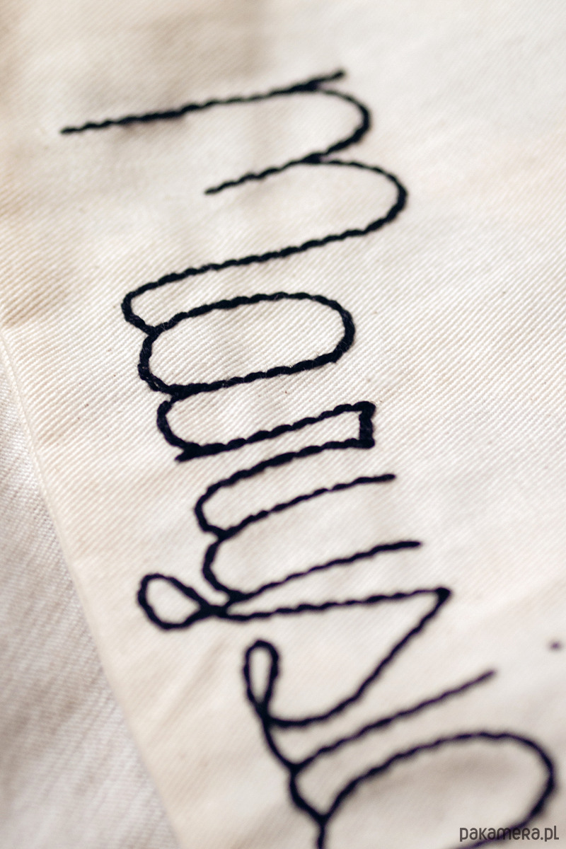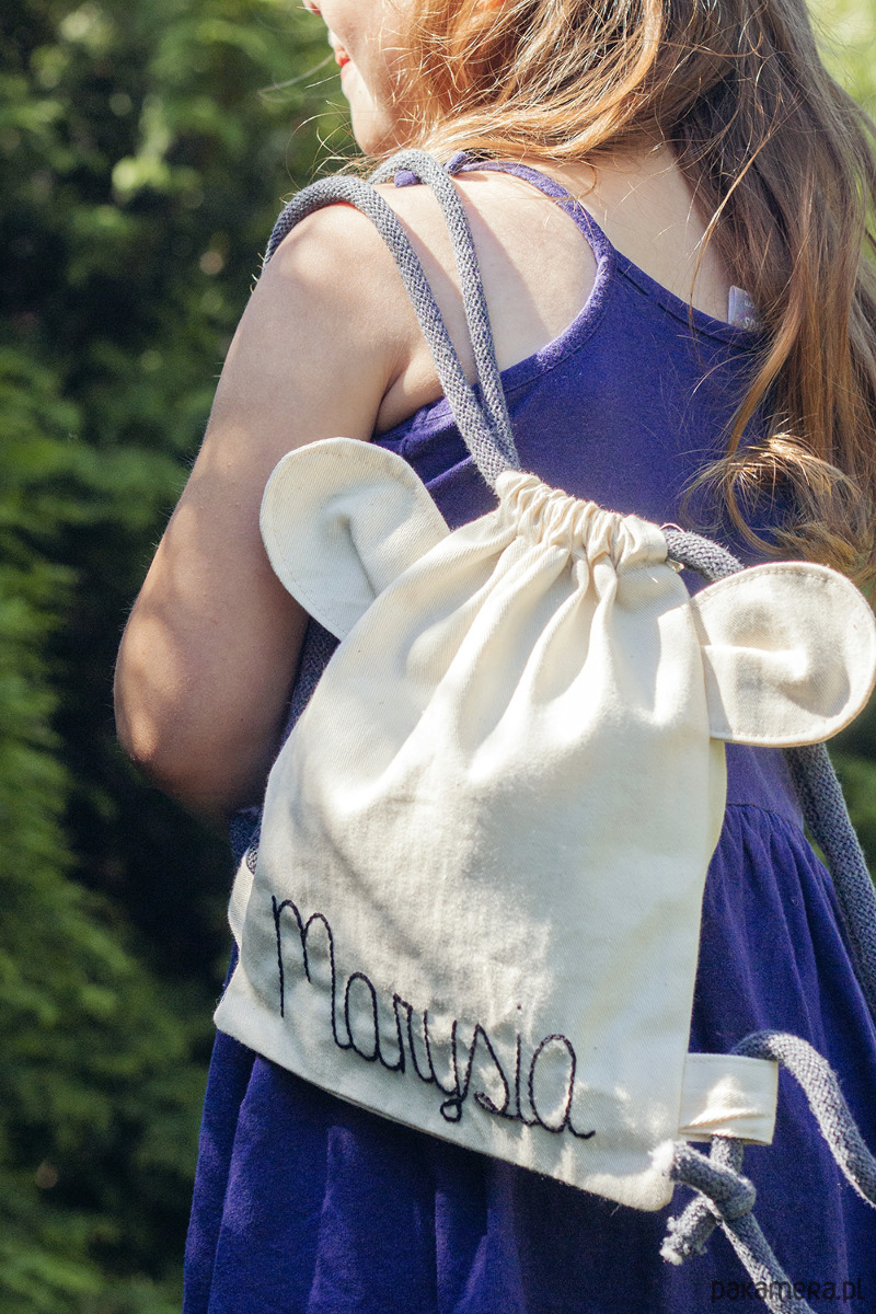 Dziecięcy plecaczek worek wykonany z surowej bawełny. Uszy misia. Ręcznie haftowane imię MARYSIA. Bawełniane sznurki w kolorze grafitowym.
