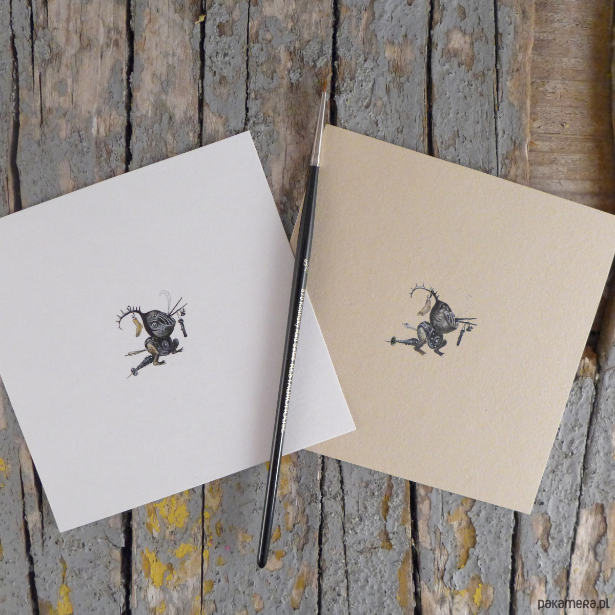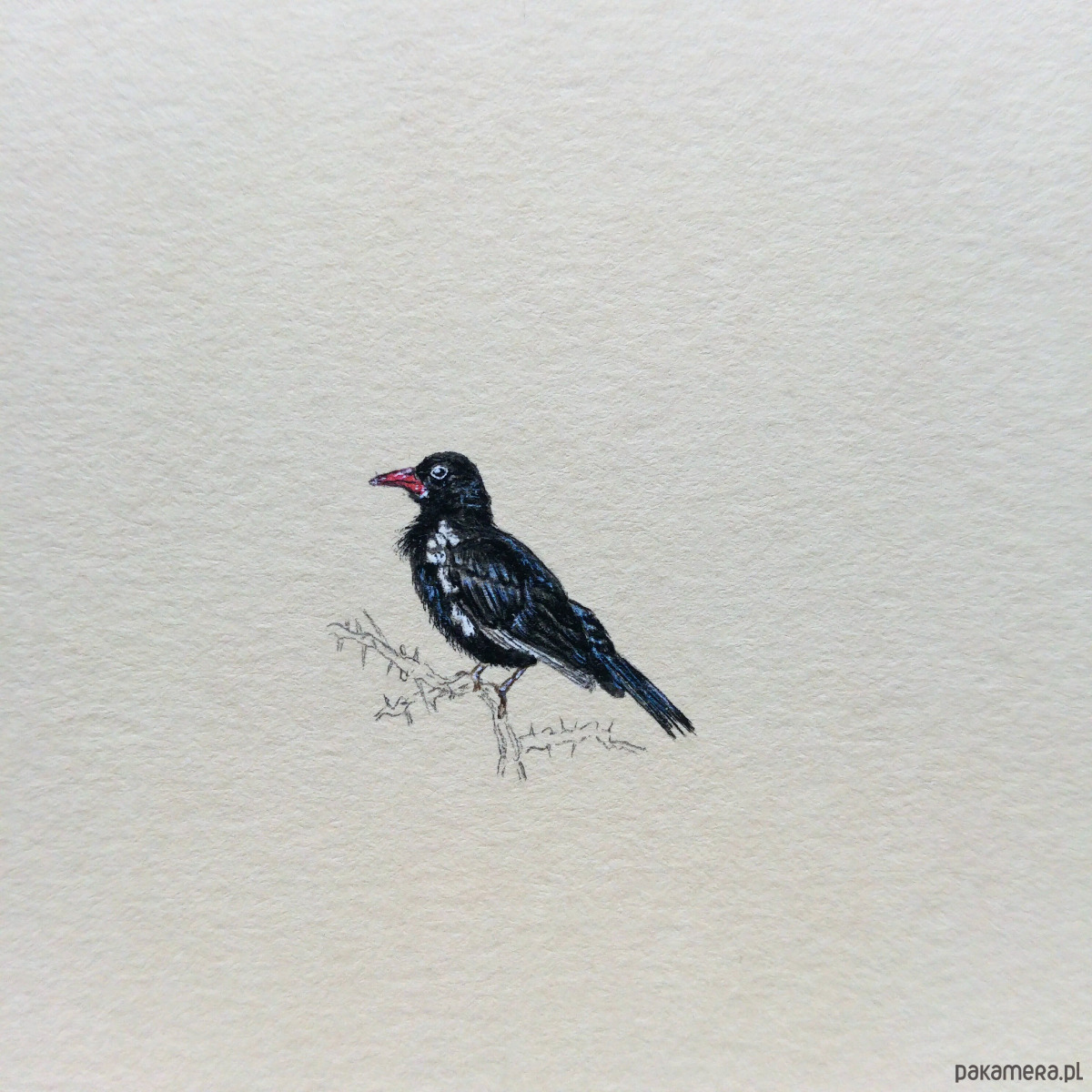 Jest to ręczny rysunek wykonany farbami wodnymi na papierze akwarelowym, białym lub kremowym.