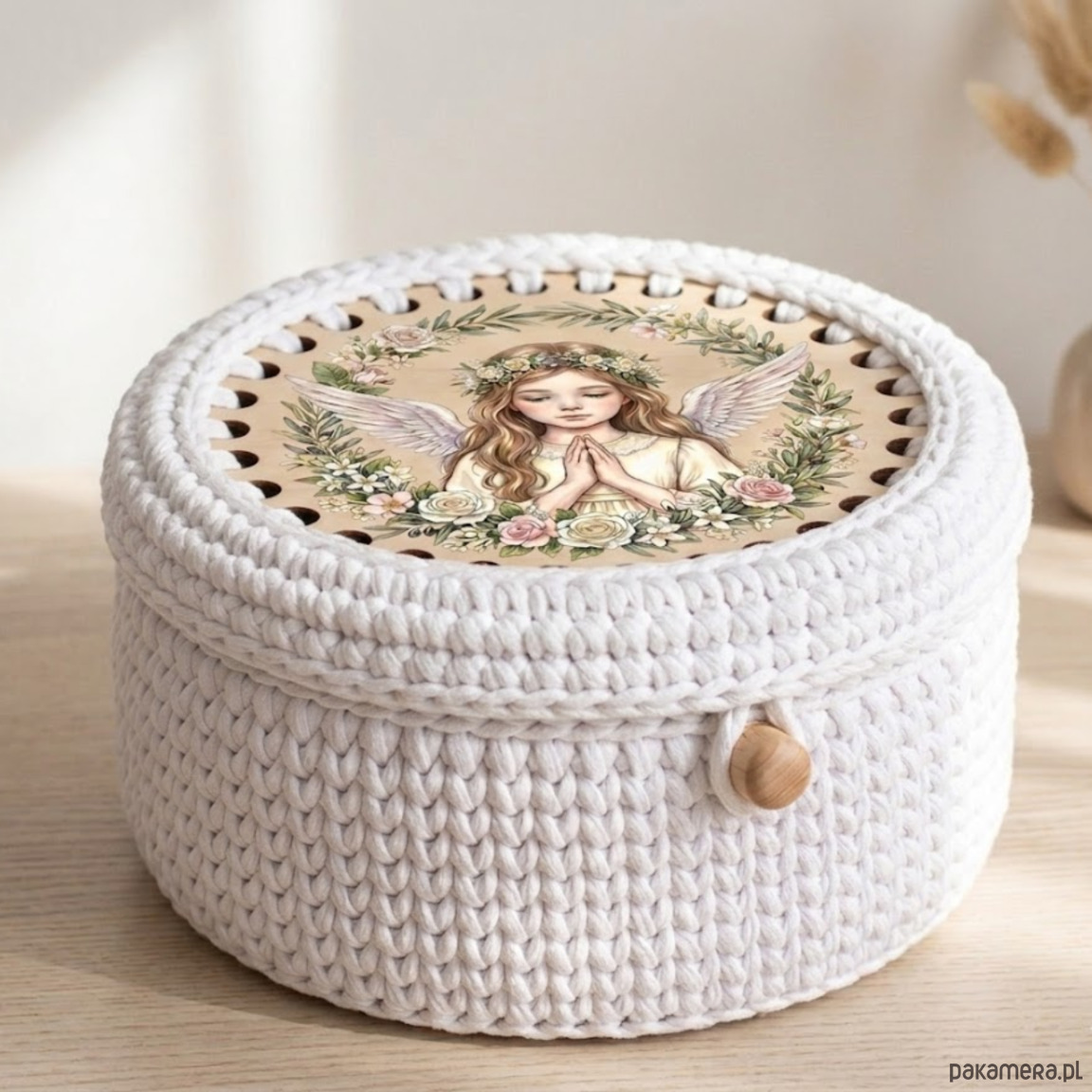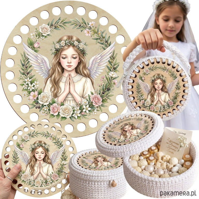 Stwórz wyjątkową, ręcznie robioną pamiątkę na Pierwszą Komunię Świętą! Drewniana baza do szydełkowania z kolorowym nadrukiem UV to idealna podstawa do wykonania eleganckiego pudełeczka, koszyczka lub torebki komunijnej.