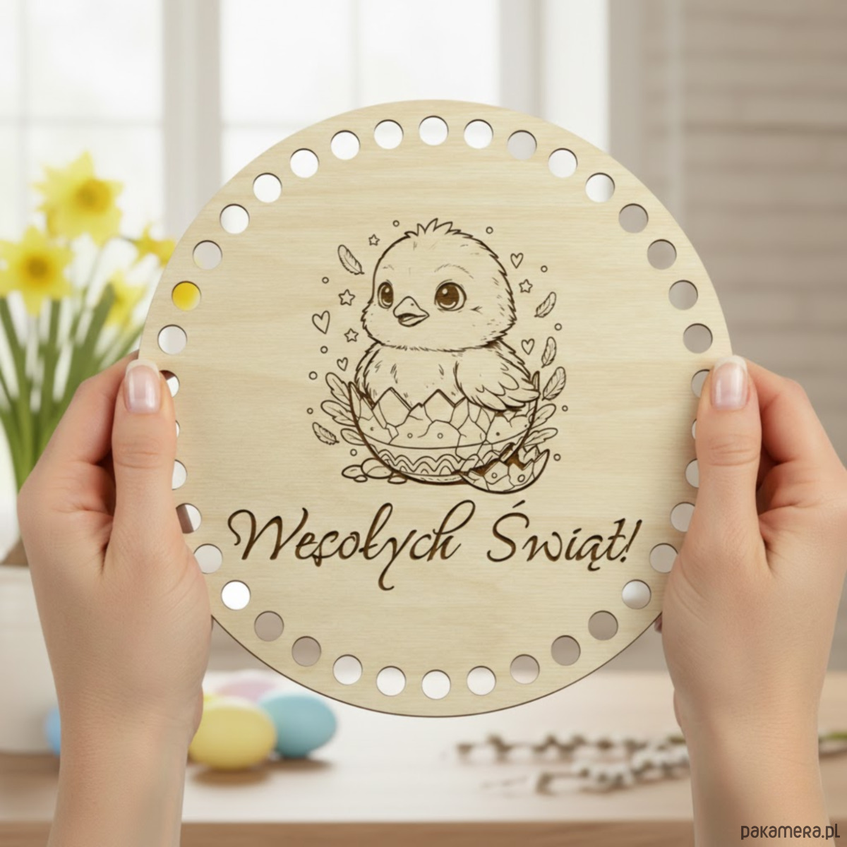 Drewniana baza wielkanocna do szydełkowania w kształcie okręgu to idealna podstawa do tworzenia drobnych, ręcznie robionych dekoracji świątecznych. Naturalne drewno i precyzyjne wycięcia sprawiają, że praca z nią jest łatwa i przyjemna.