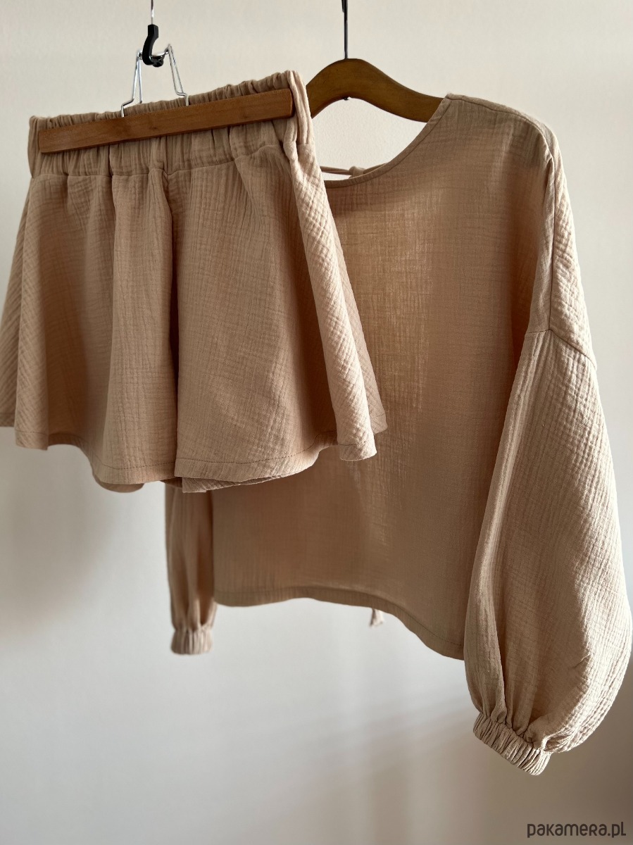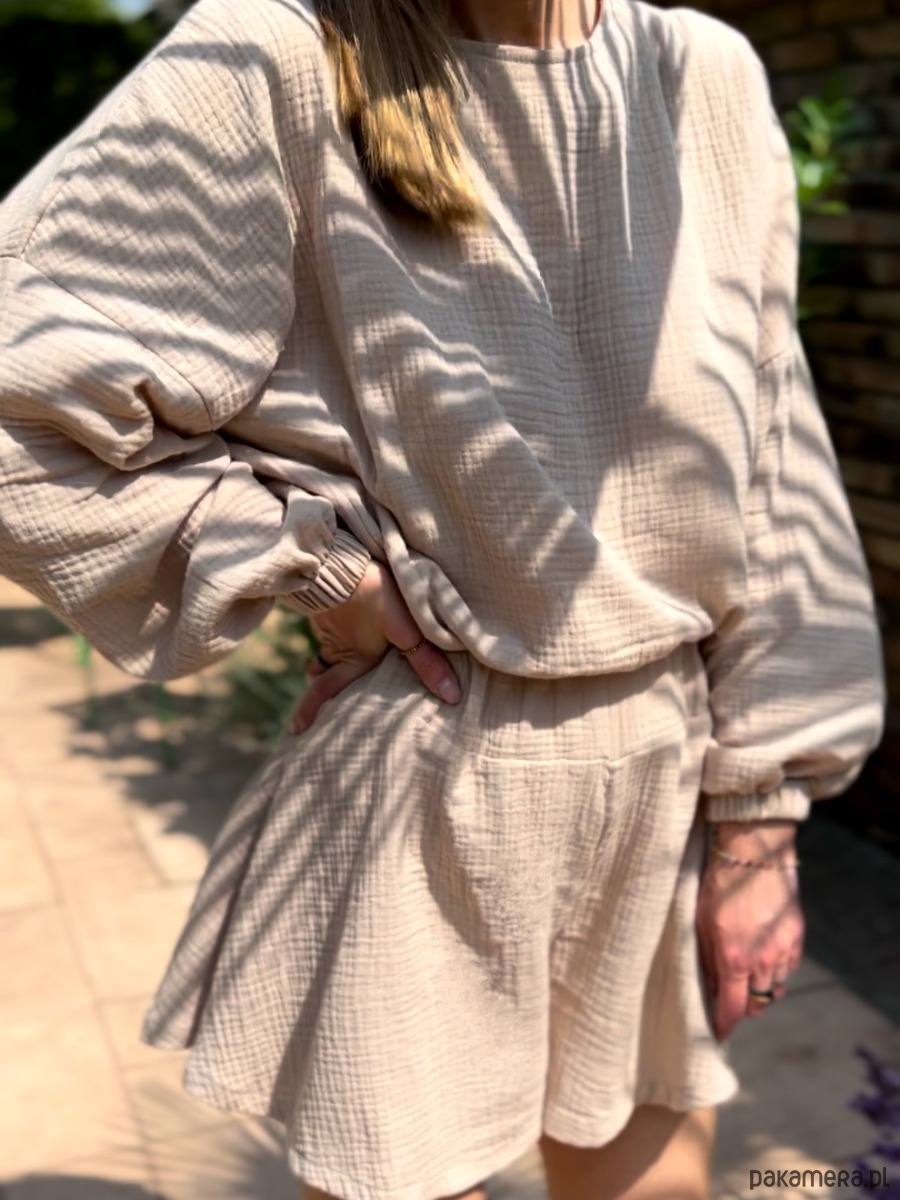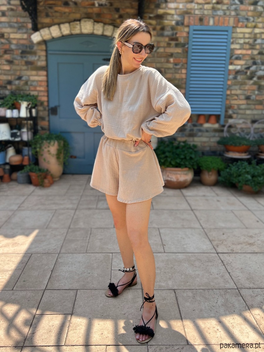 Efektowna bluzka i szerokie szorty z delikatnej, muślinowej tkaniny, unoszą się jak motyl podczas każdego ruchu, pięknie eksponując sylwetkę.