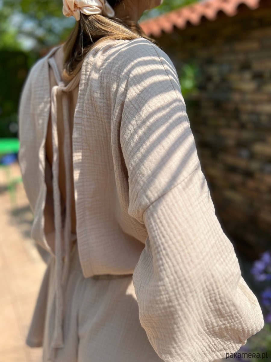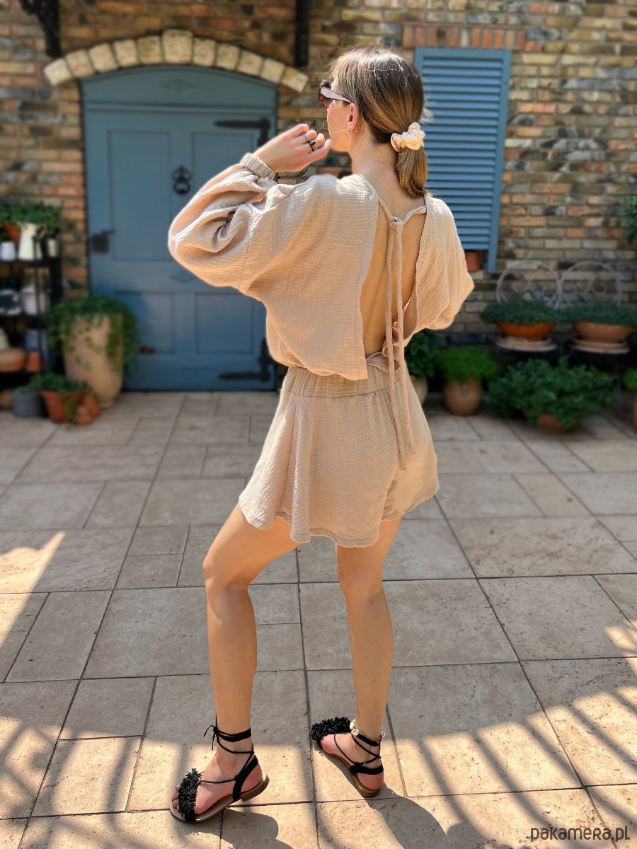 Bluzkę z głębokim dekoltem na plecy doskonale równoważy prosty, pełny przód. Dzięki krojowi oversize pozostaje totalnie wygodna. Spodenki o rozkloszowanych nogawkach dodają kobiecości, a ich wysoki stan i gumka w pasie czynią je komfortowymi w codziennym użytkowaniu.