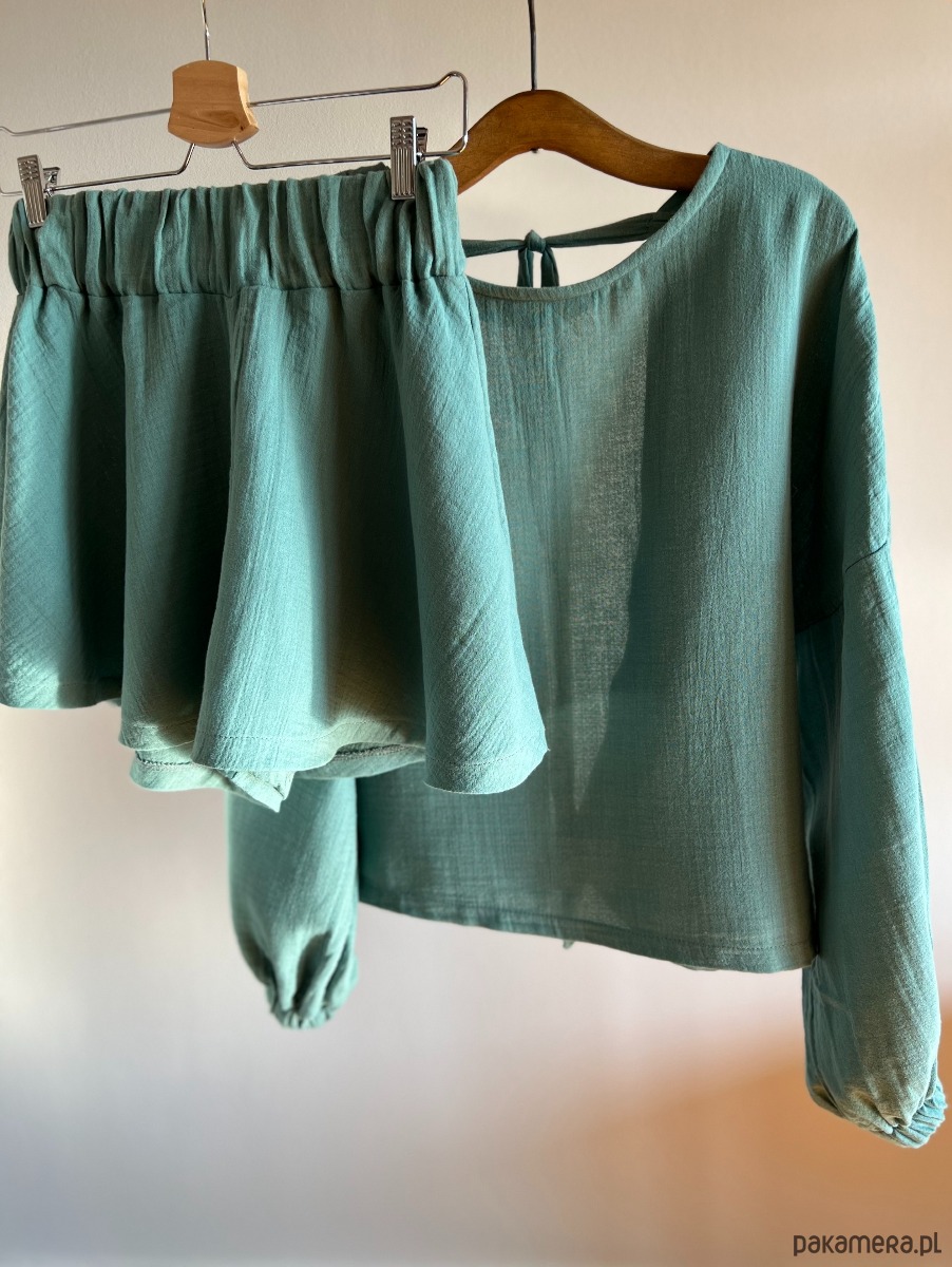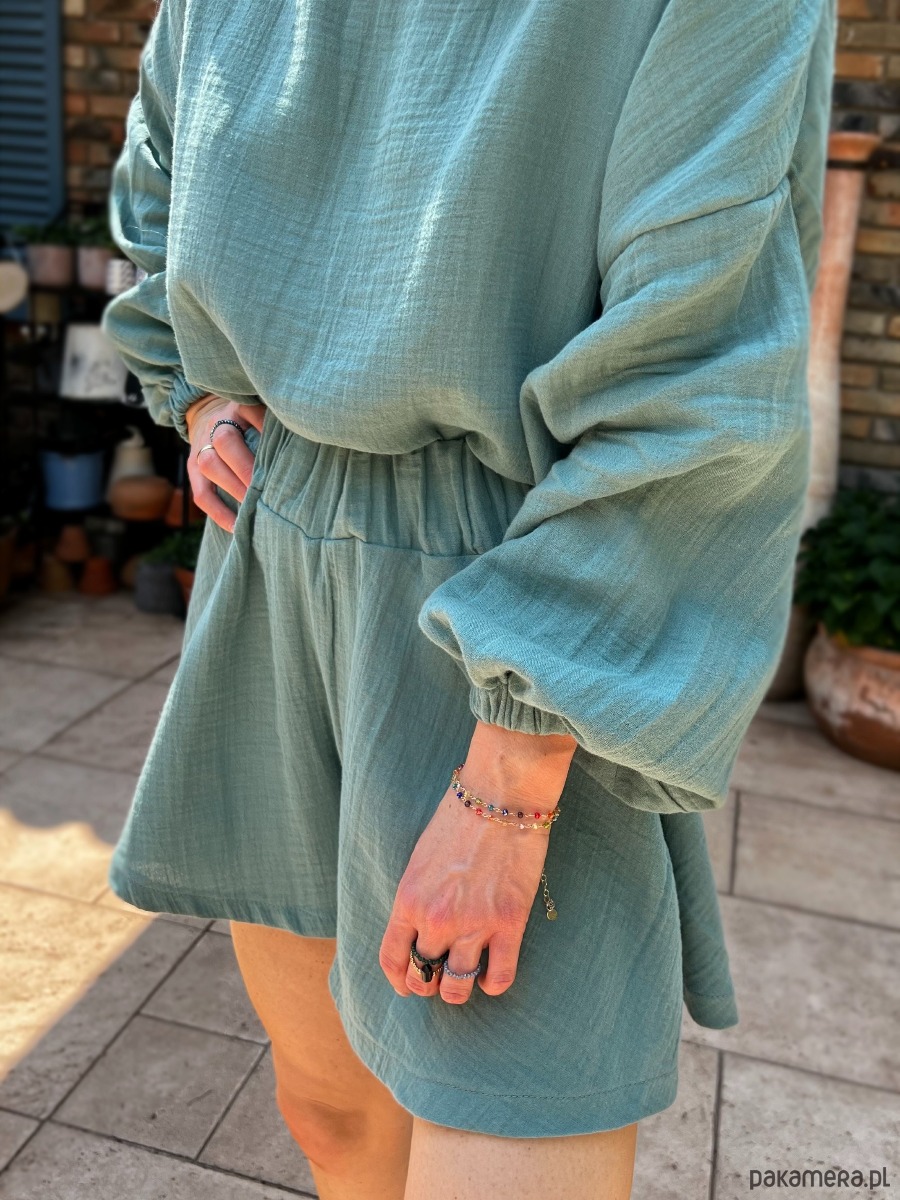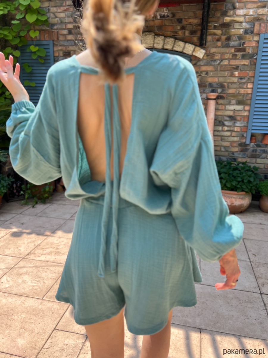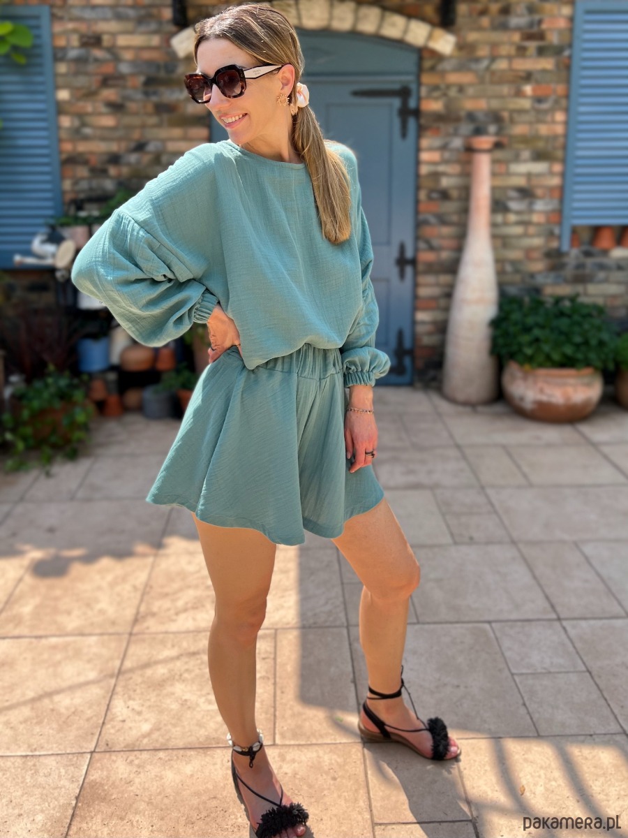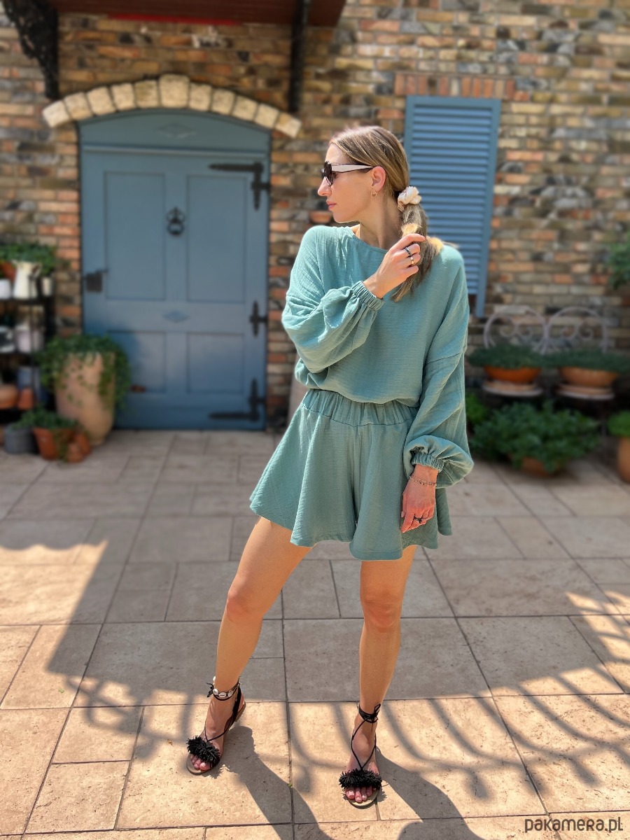 Efektowna bluzka i szerokie szorty z delikatnej, muślinowej tkaniny, unoszą się jak motyl podczas każdego ruchu, pięknie eksponując sylwetkę.