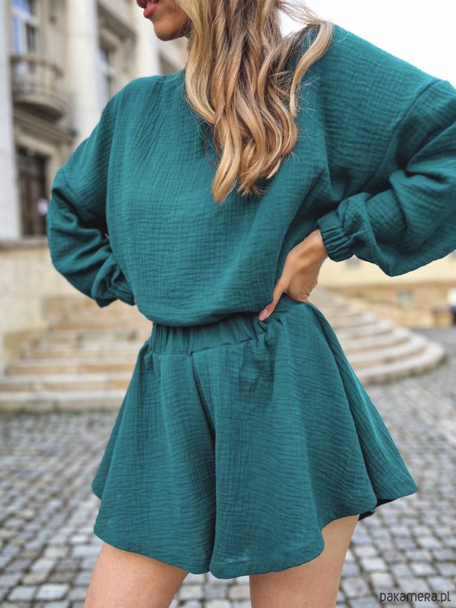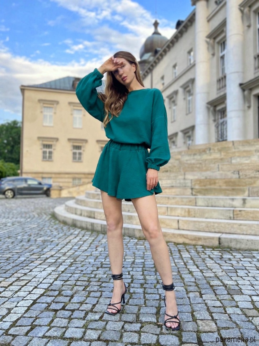 Efektowna bluzka i szerokie szorty z delikatnej, muślinowej tkaniny, unoszą się jak motyl podczas każdego ruchu, pięknie eksponując sylwetkę.