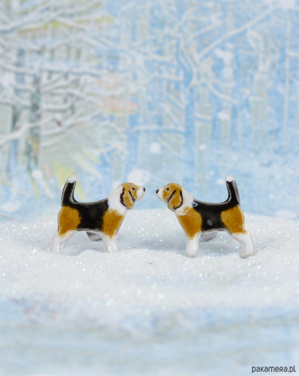 Malutkie pieski mają wymiary: 1,7cm wysokość, 1,9 cm szerokość, 1,5mm grubość, a ich kolorystyka jest nieco rudawa. Pieski są malutkie i leciutkie.Każda para jest inna:)))) Beagle zostały solidnie umocowane na sztyftach ze stali chirurgicznej- antyalergiczna w kolorze oksydowanego srebra.Wysyłam w ozdobnym pudełeczku.