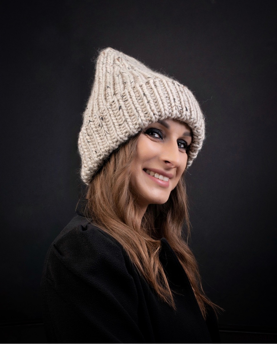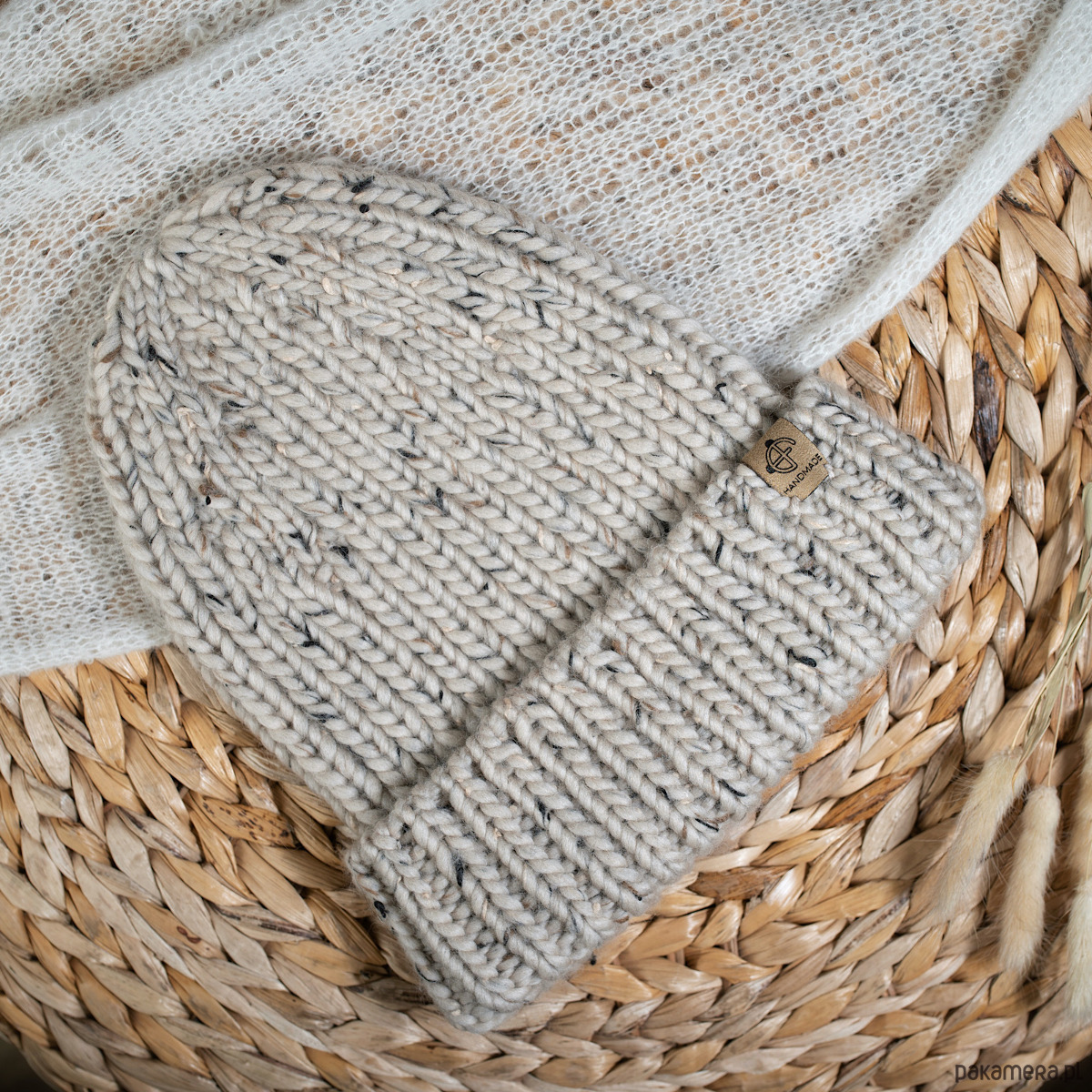 Ręcznie robiona czapka w pięknym kolorze jasnym beżowym tweed naturalny, wykonana z