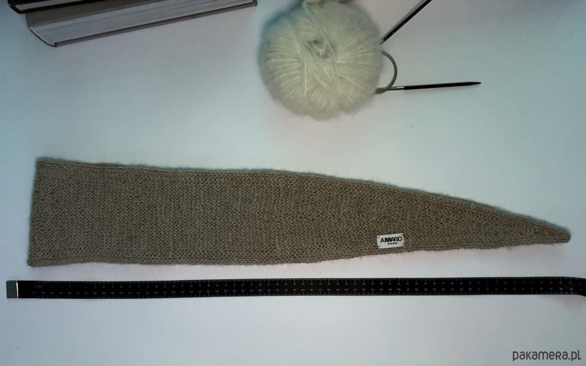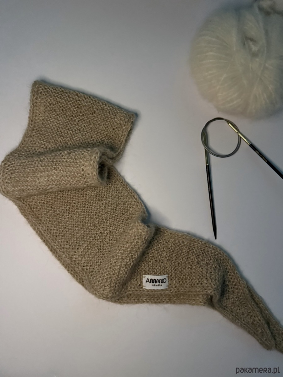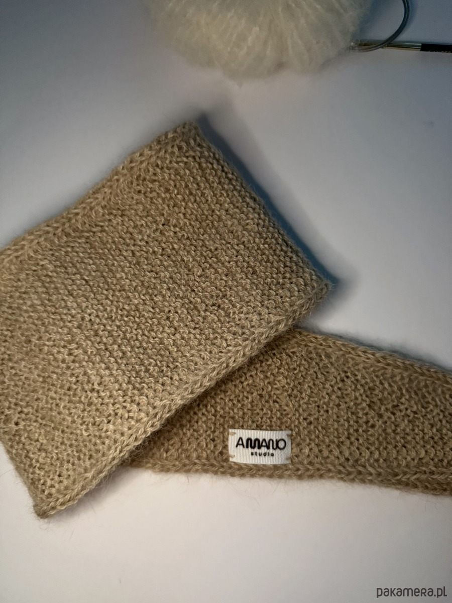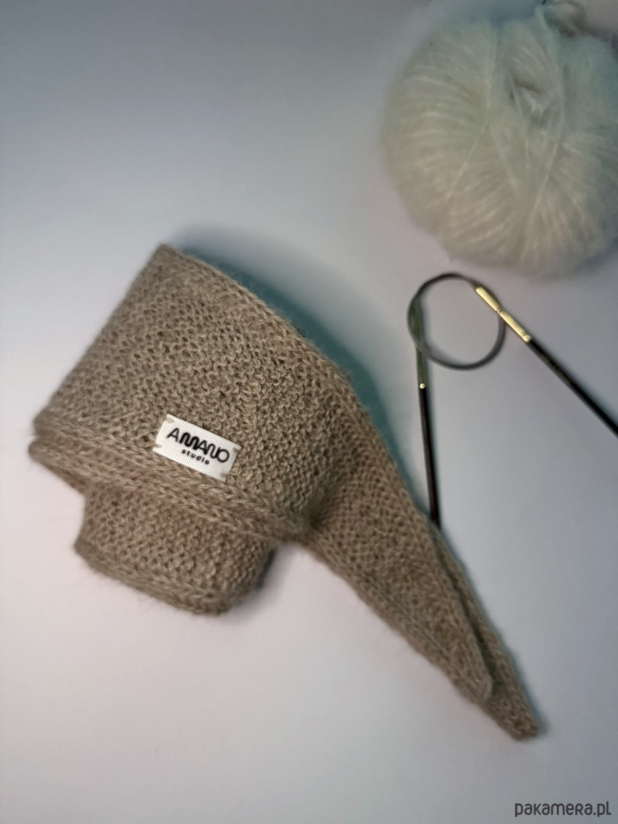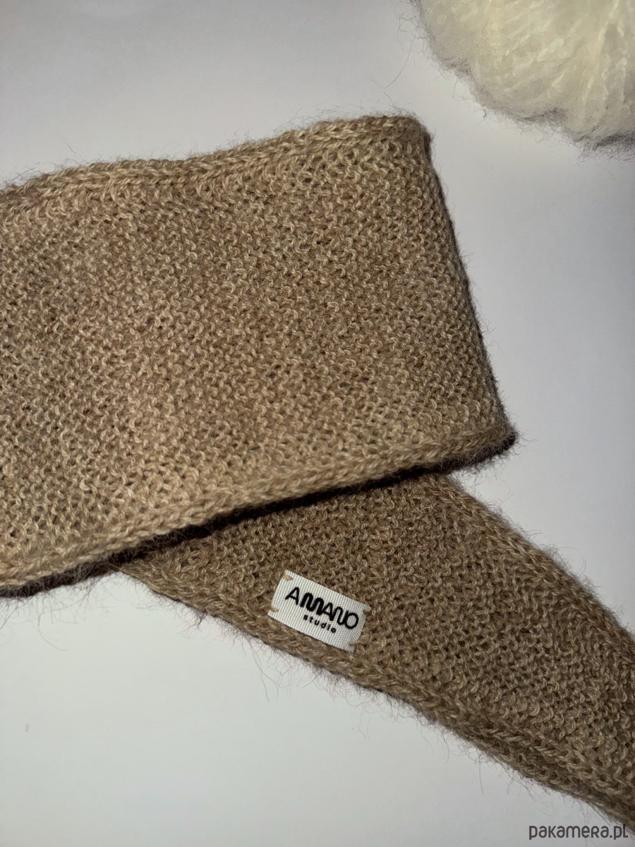 Szaliczek/apaszka wykonana na drutach z włóczki w kolorze beżowym. Skład włóczki to 100% alpaka.