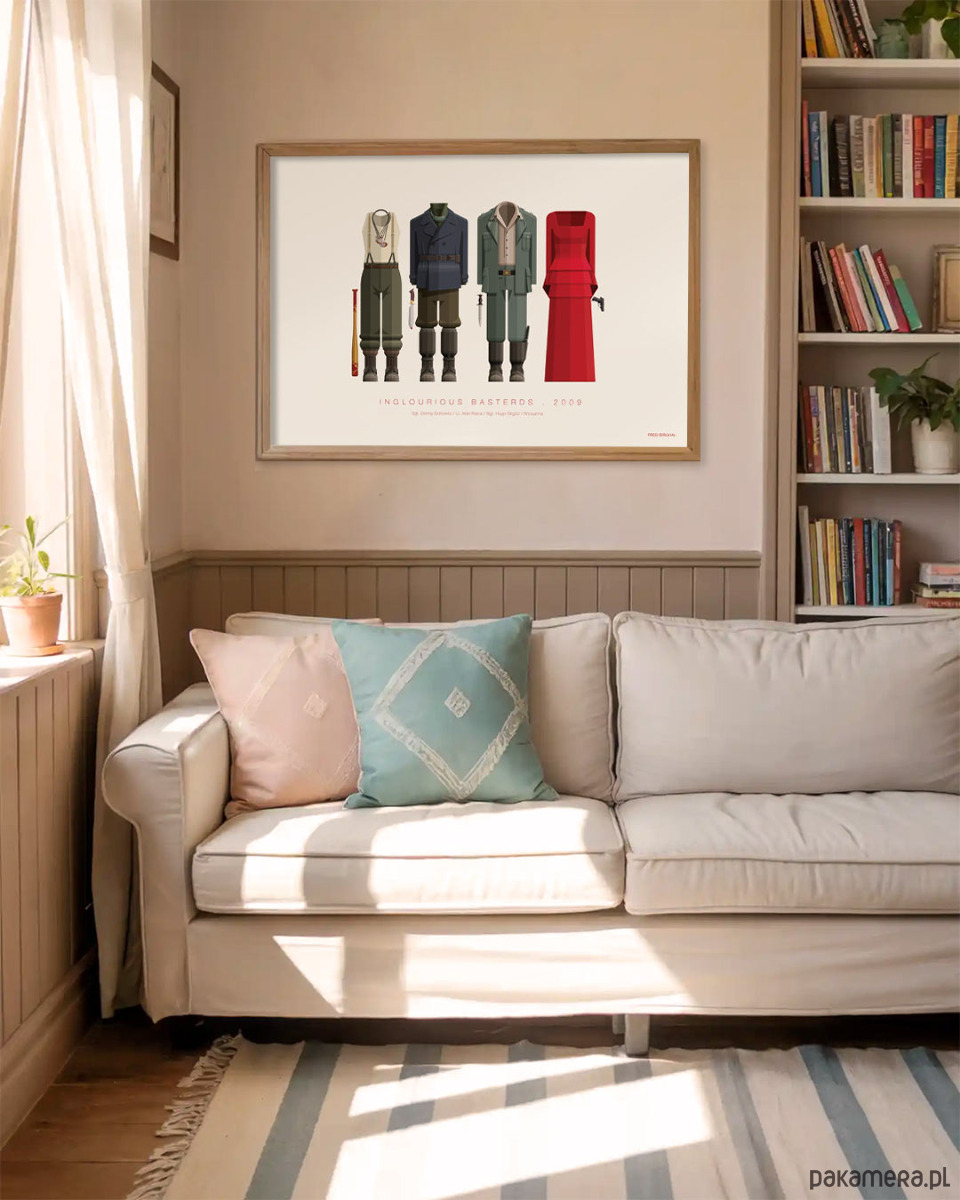 Plakat inspirowany filmem Bękarty wojny (Inglourious Basterds), reż. Quentin Tarantino. Grafika przedstawia trzy kostiumy "bękartów" i czerwoną, balową suknię Shosanny.