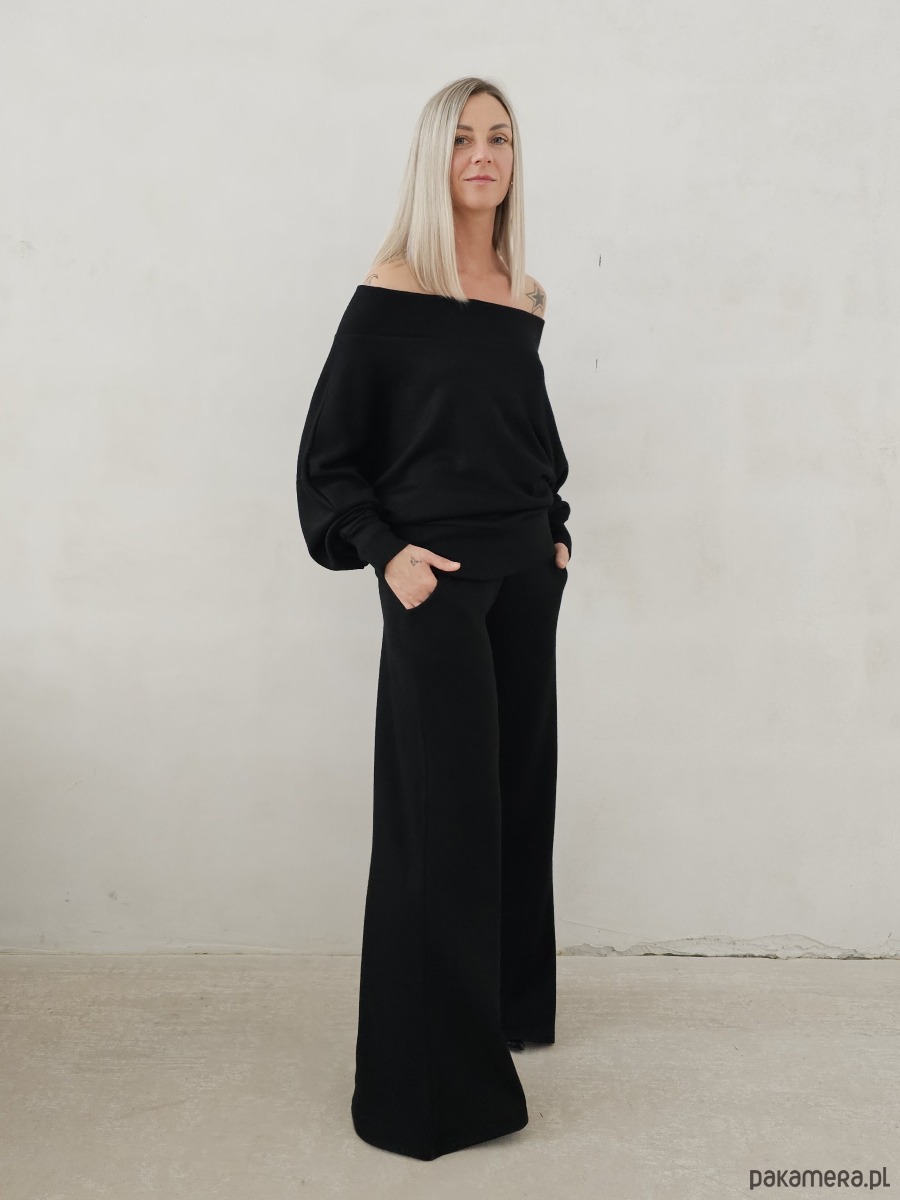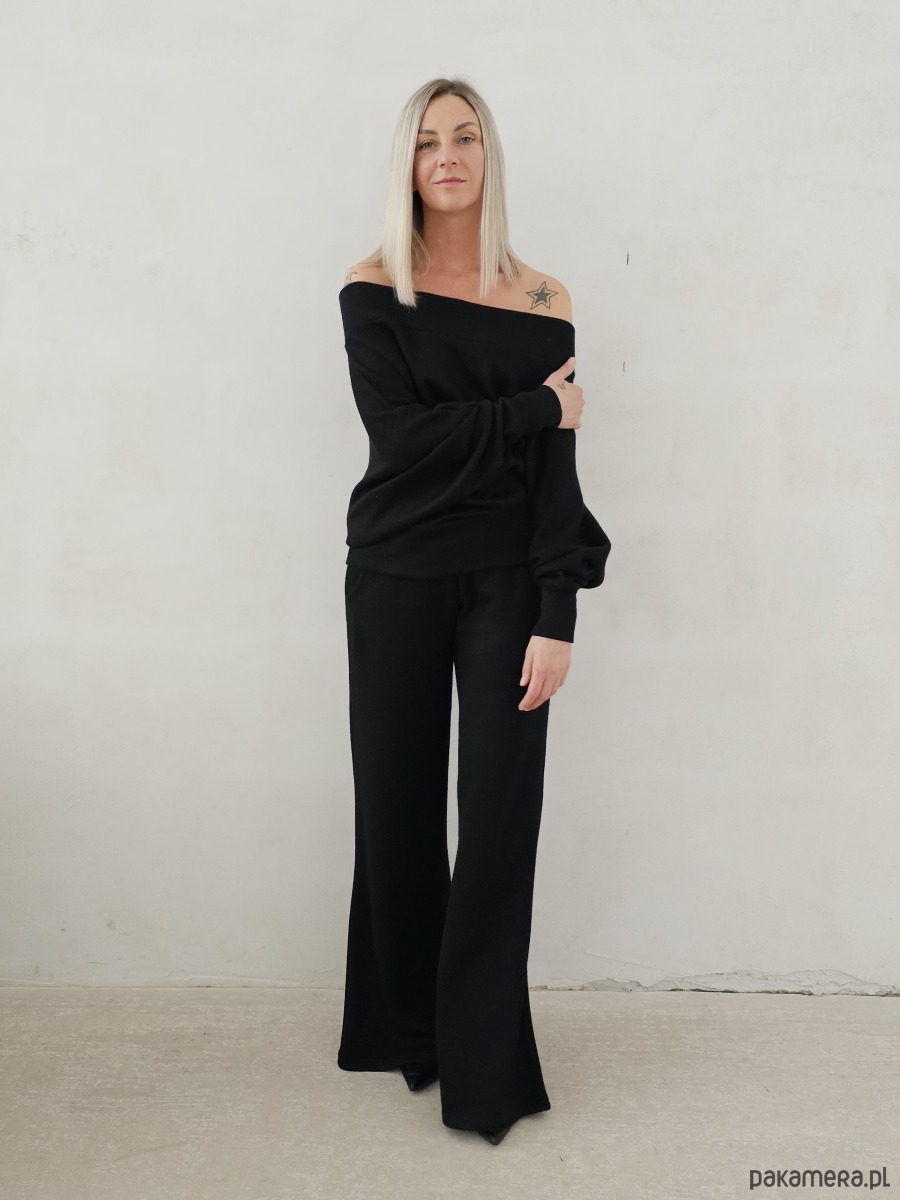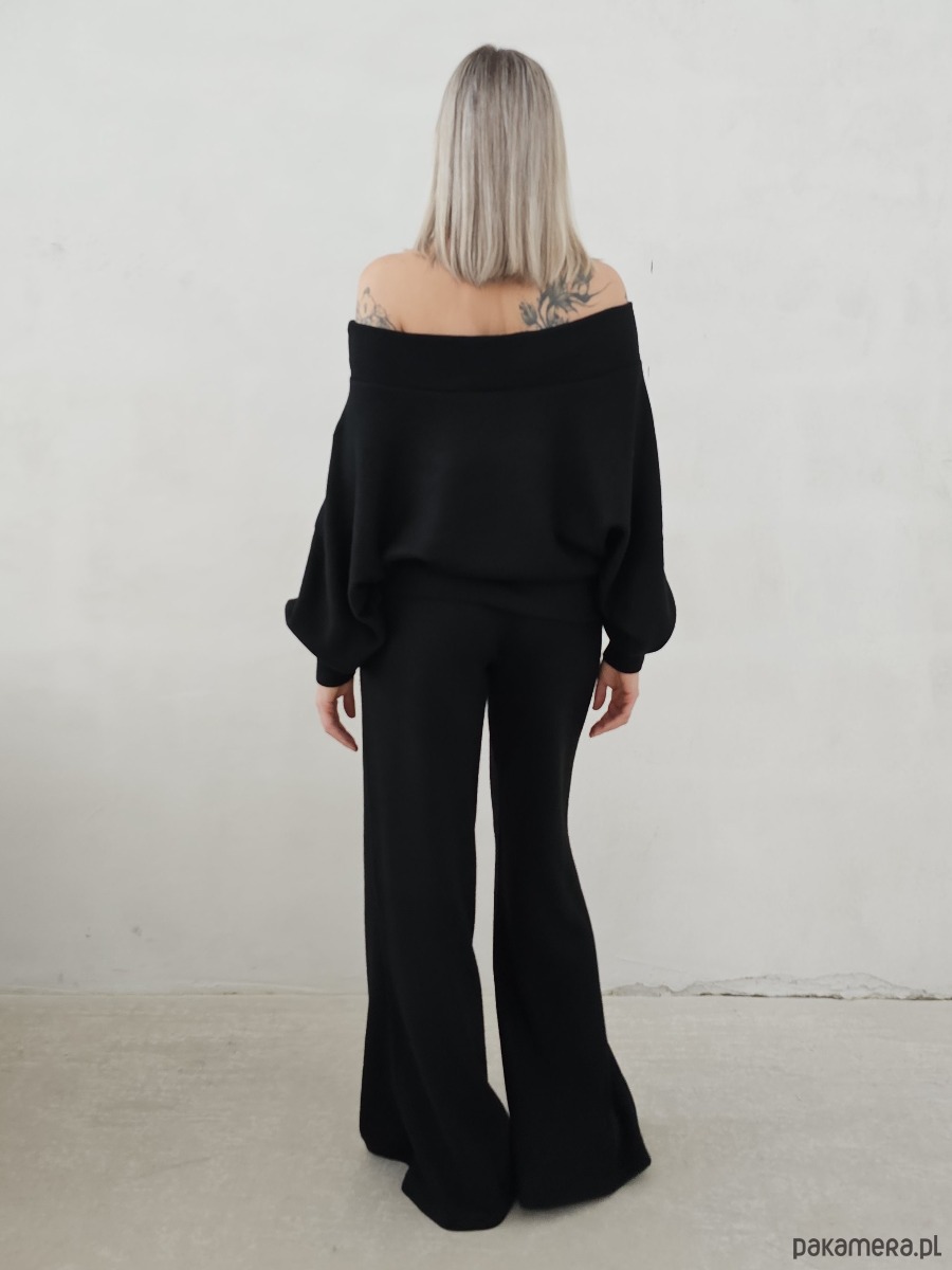 Bellita dzianinowy komplet dzwony i bluzka opadające ramię czarny