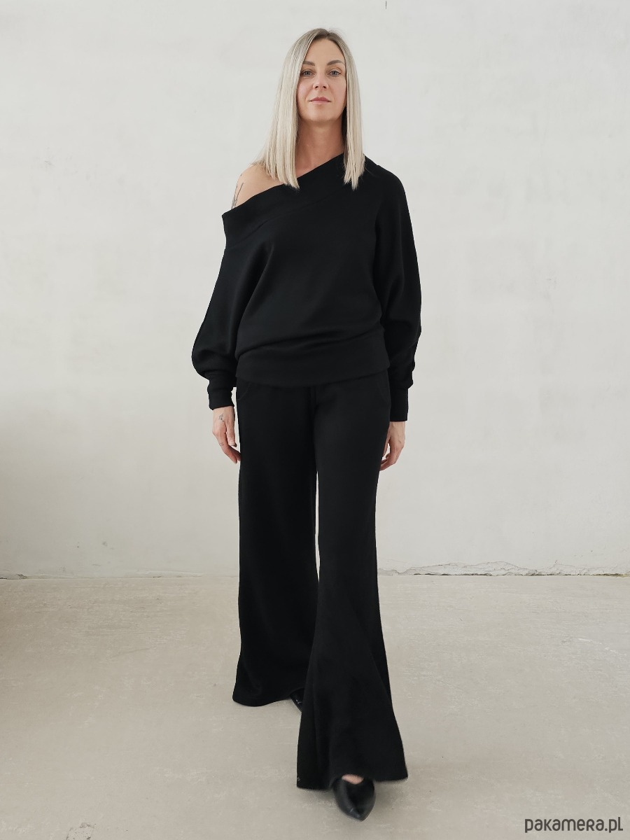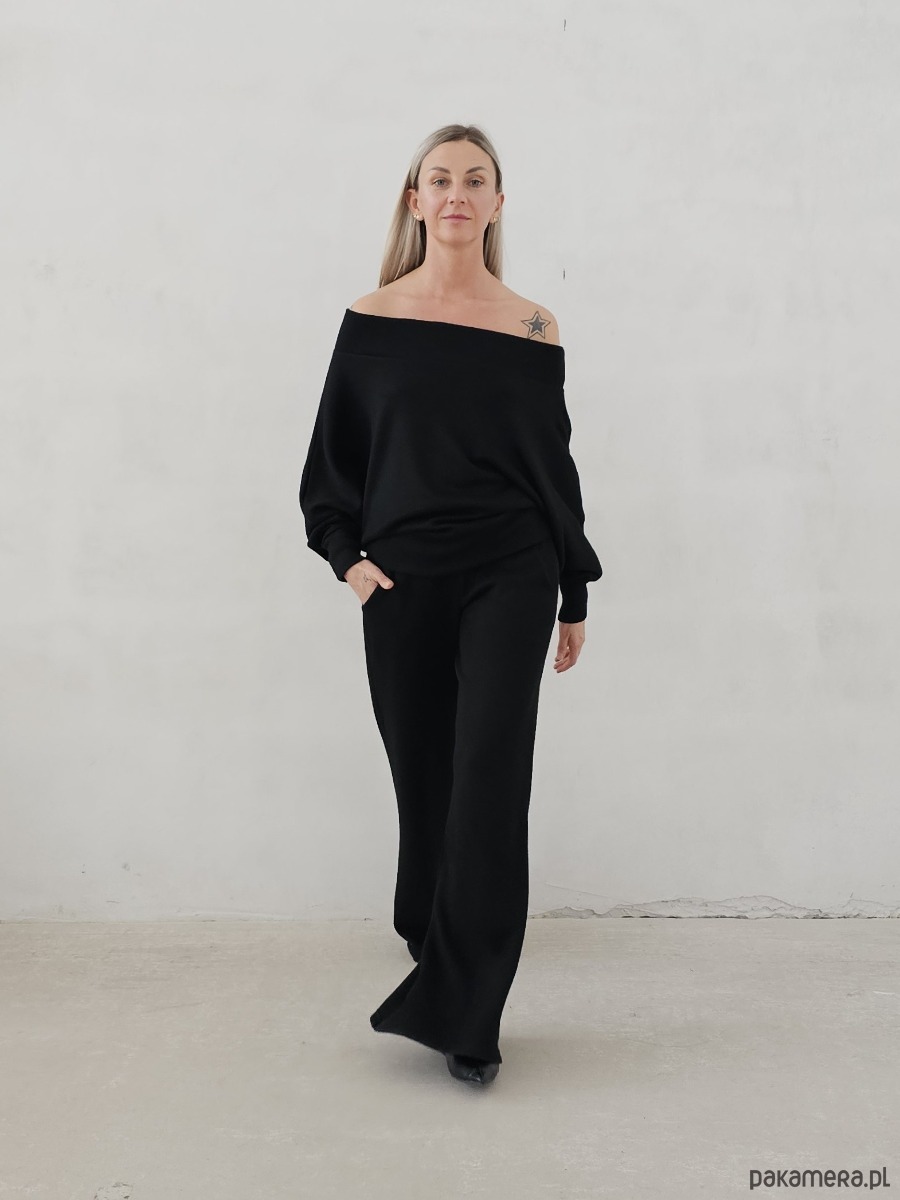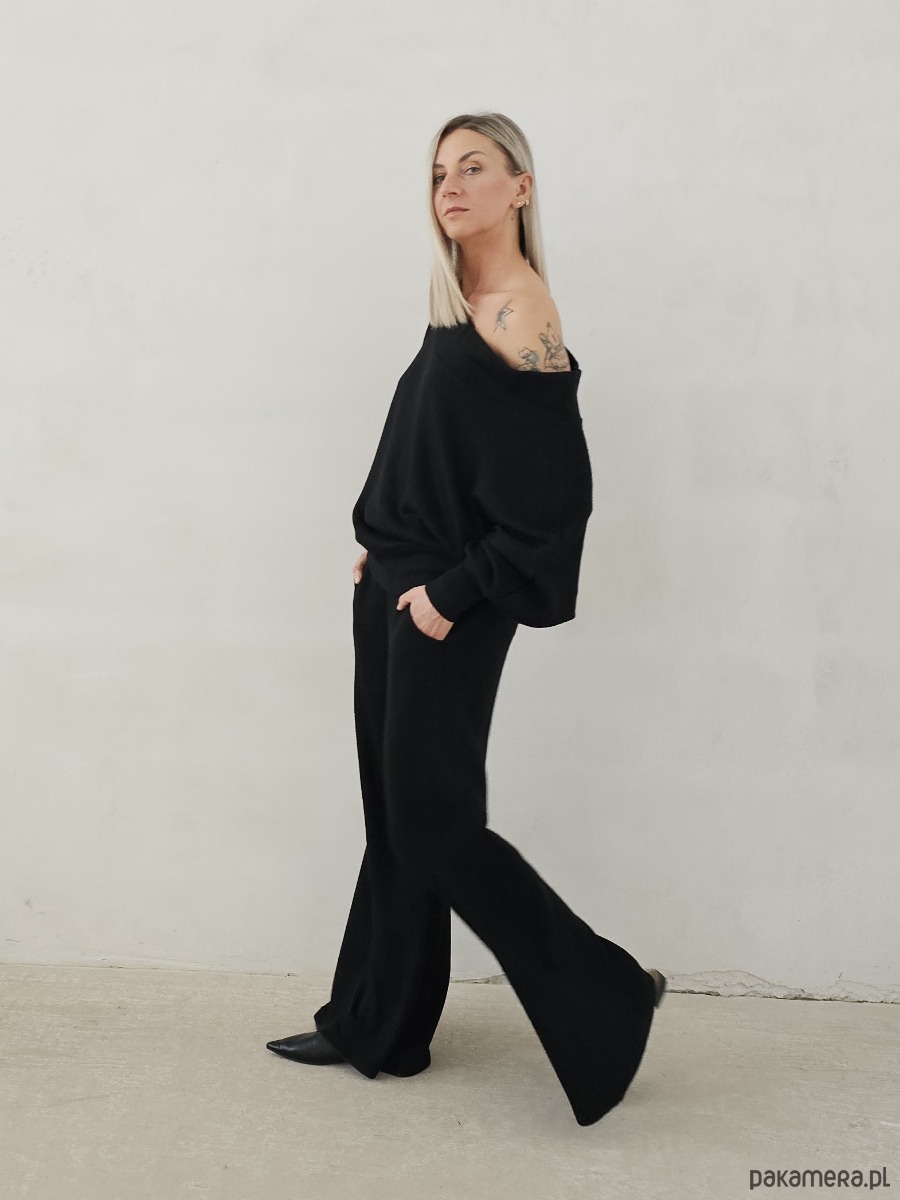 Bellita dzianinowy komplet dzwony i bluzka opadające ramię czarny