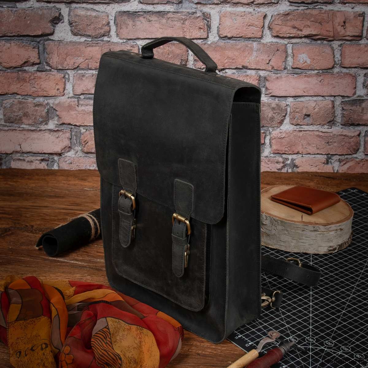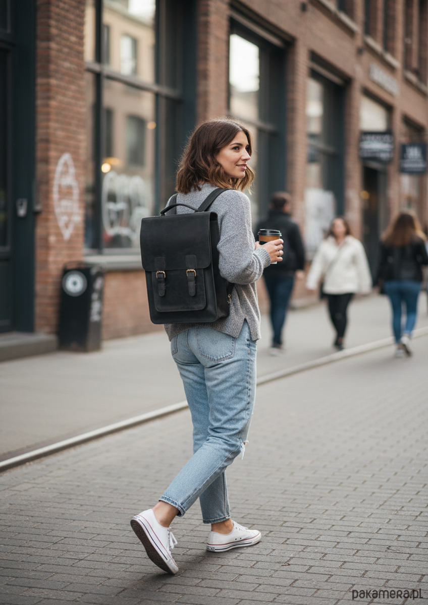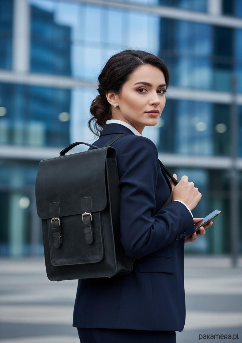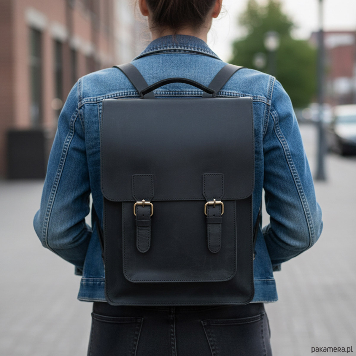Plecak wykonany jest z naturalnej skóry licowej pierwszego gatunku (1,5–1,6 mm) z garbarni w Radomiu.