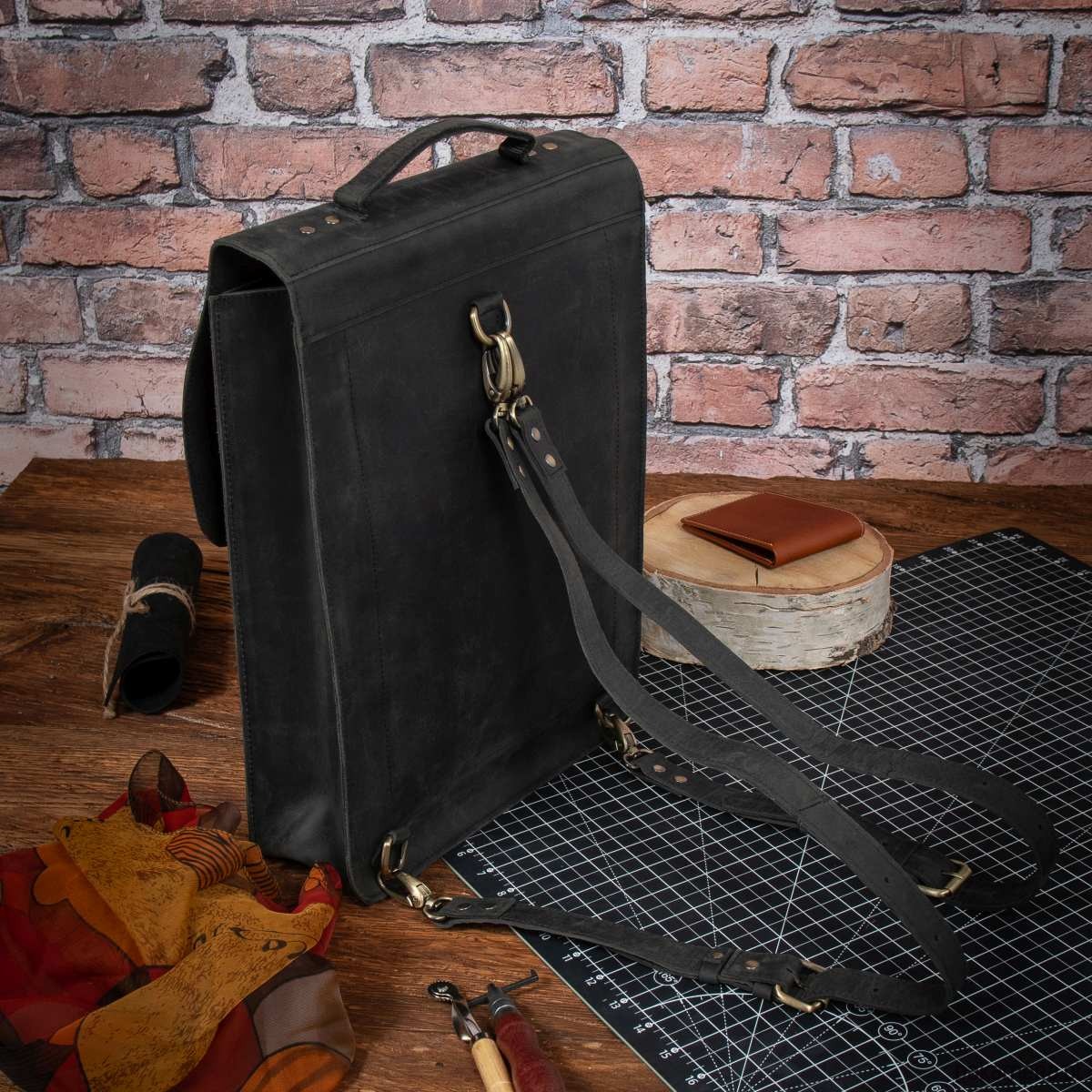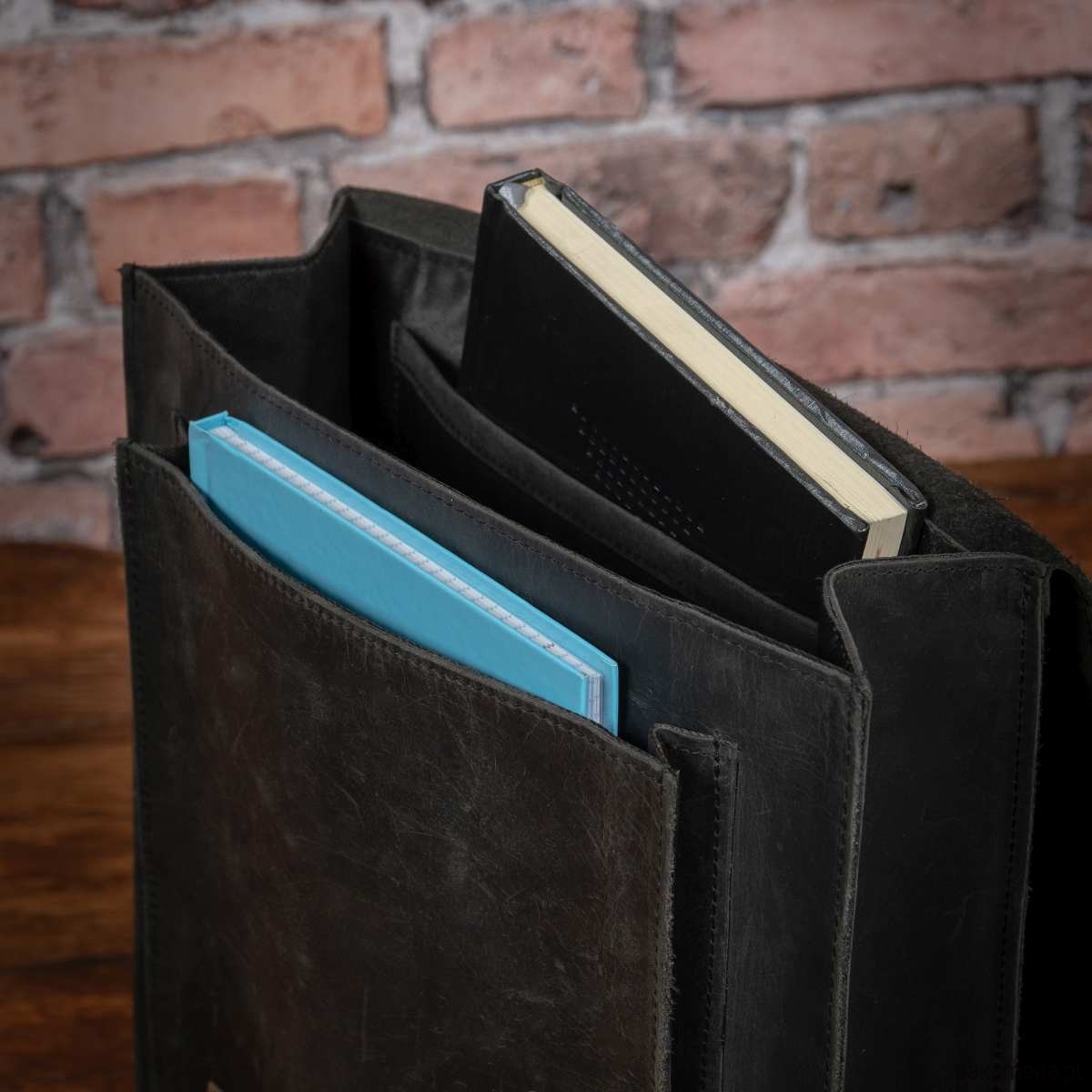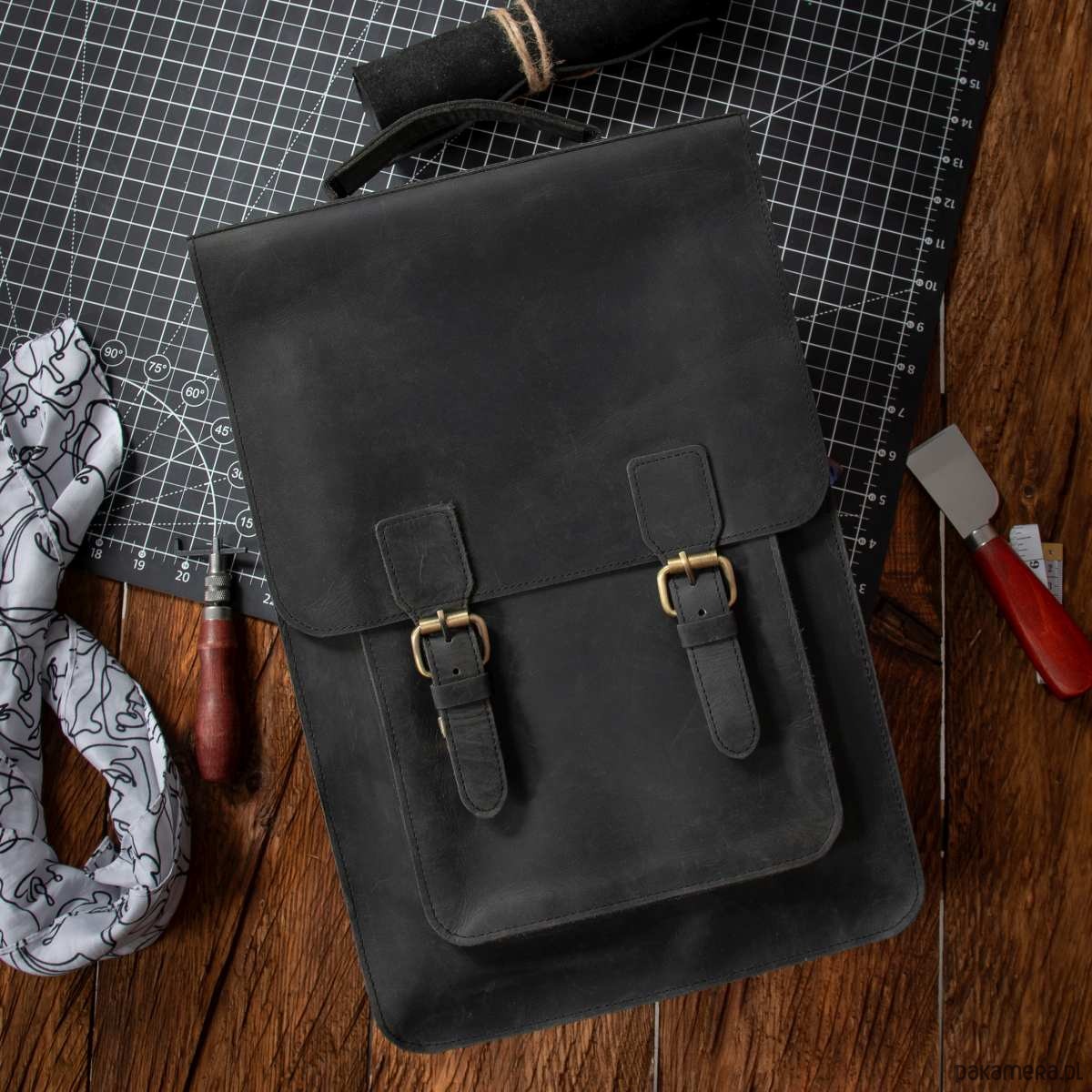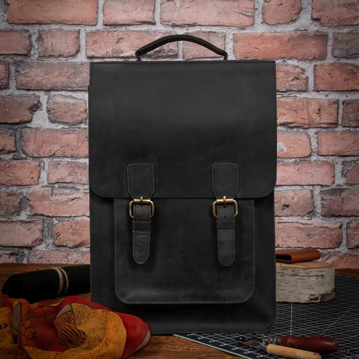 Plecak wykonany jest z naturalnej skóry licowej pierwszego gatunku (1,5–1,6 mm) z garbarni w Radomiu.
