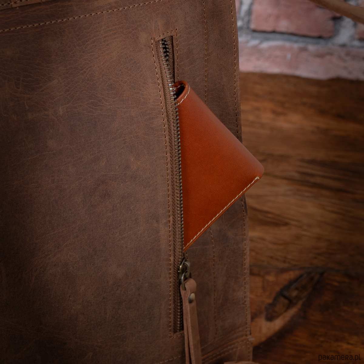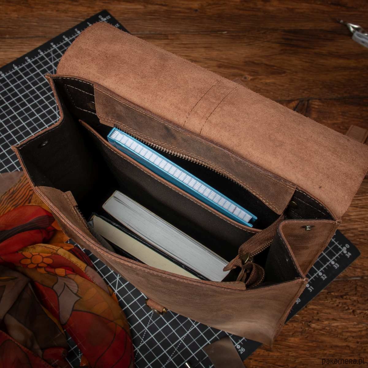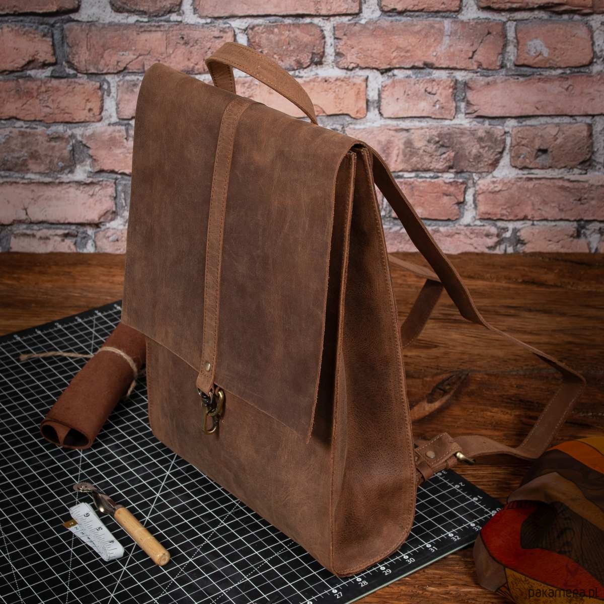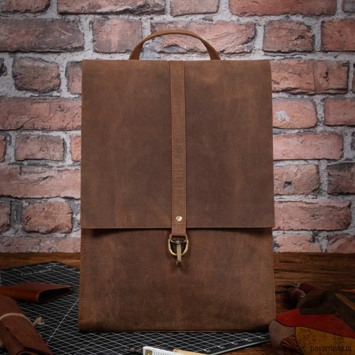 Plecak wykonany jest z naturalnej skóry licowej pierwszego gatunku (1,5–1,6 mm) z garbarni w Radomiu.