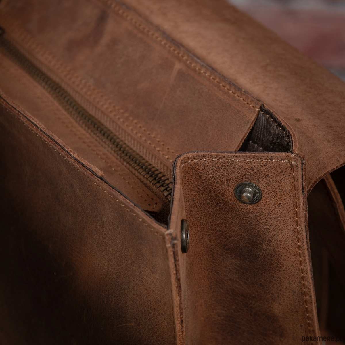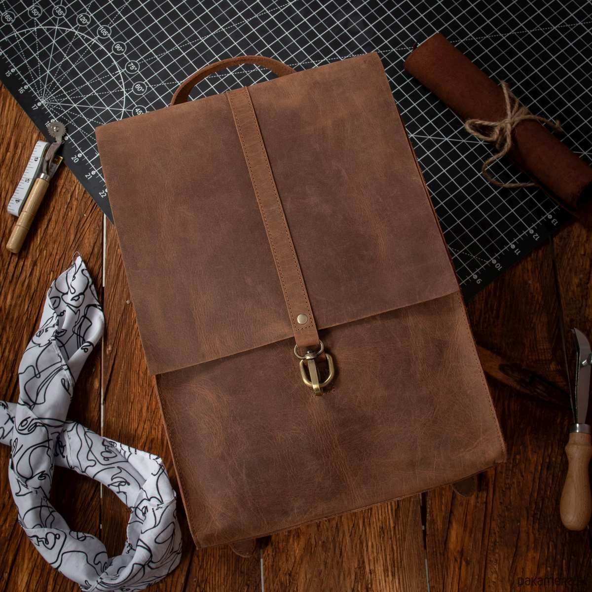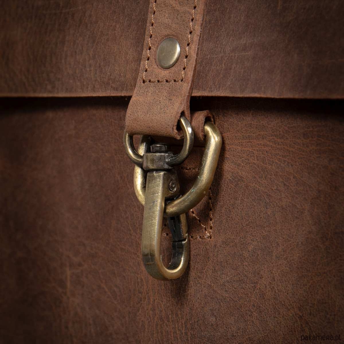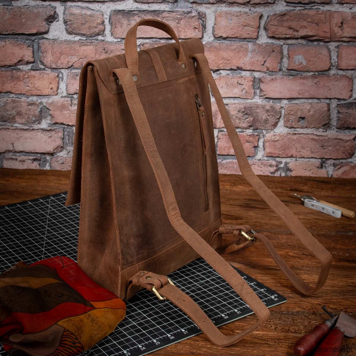Plecak wykonany jest z naturalnej skóry licowej pierwszego gatunku (1,5–1,6 mm) z garbarni w Radomiu.
