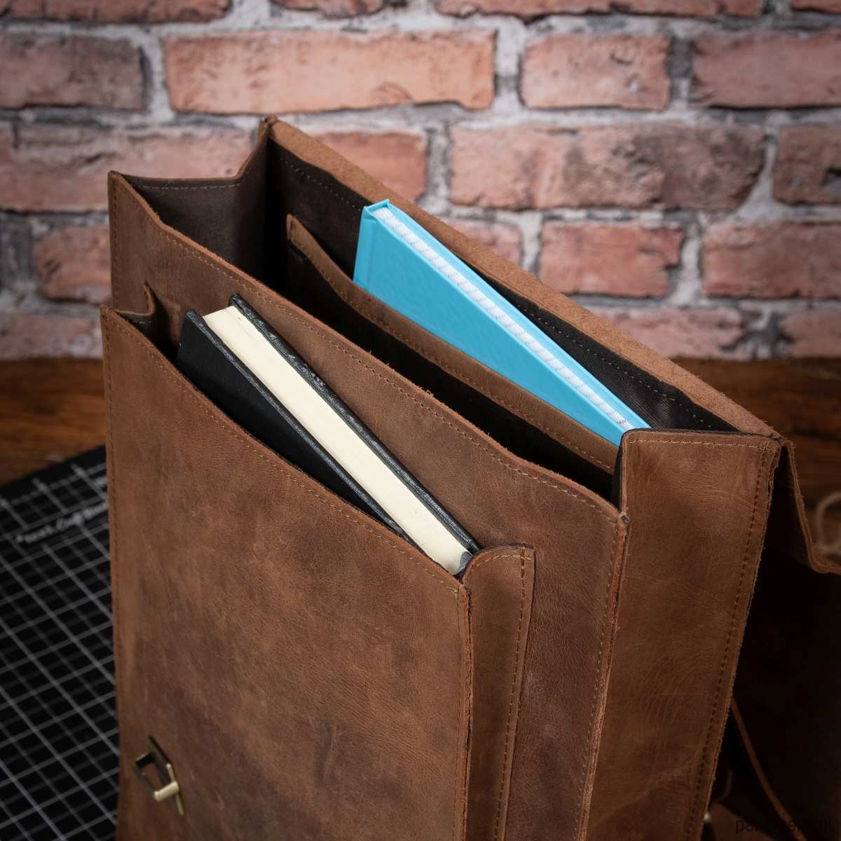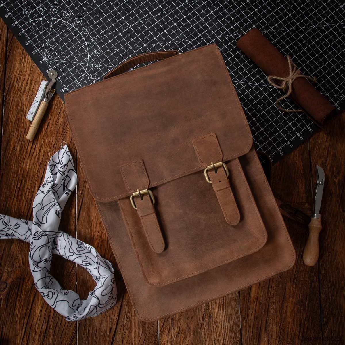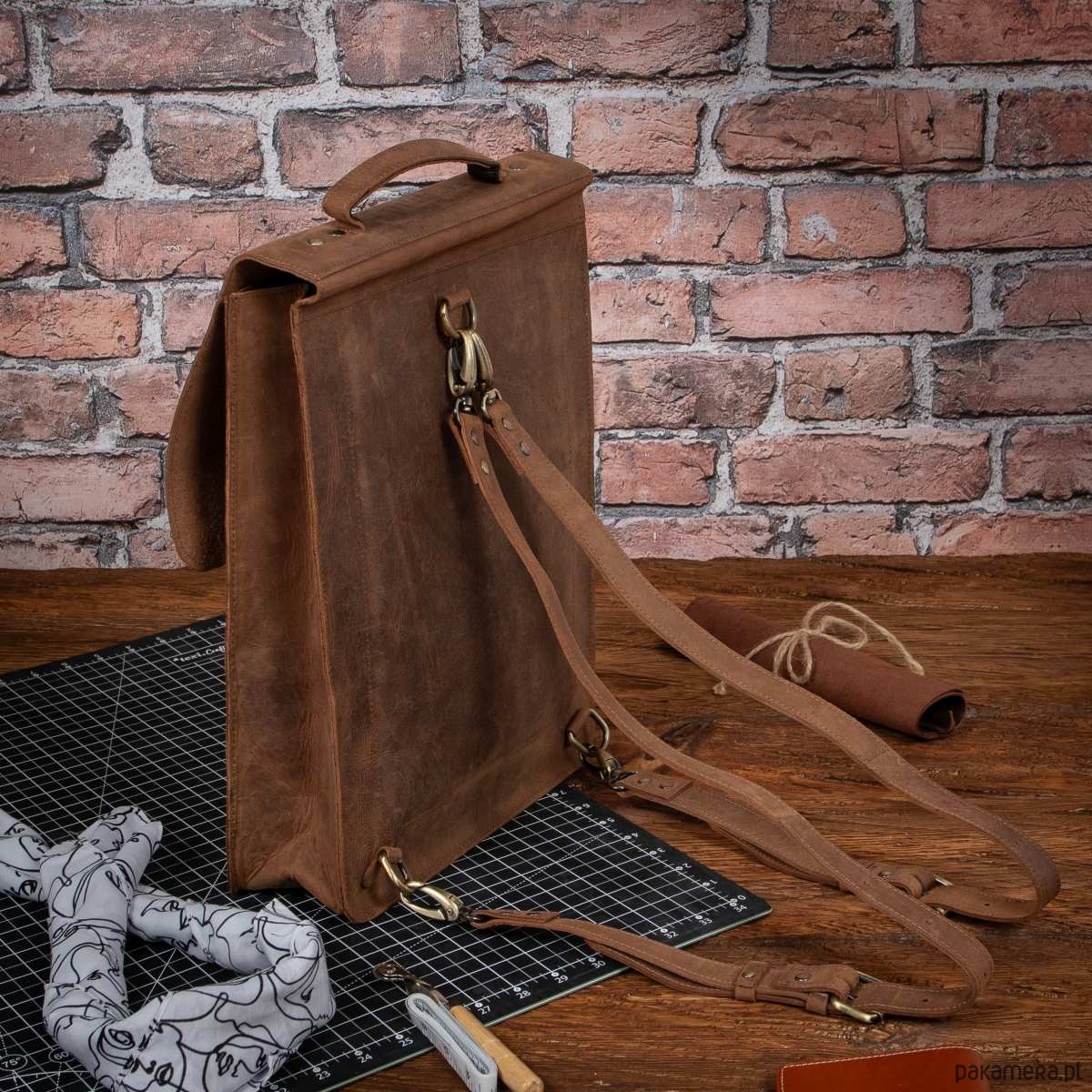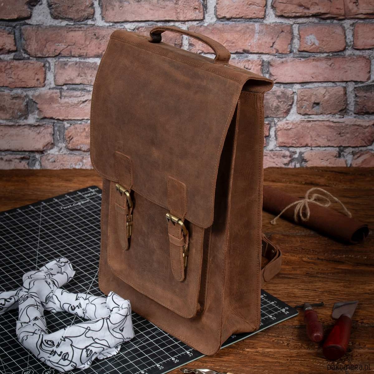 Plecak wykonany jest z naturalnej skóry licowej pierwszego gatunku (1,5–1,6 mm) z garbarni w Radomiu.