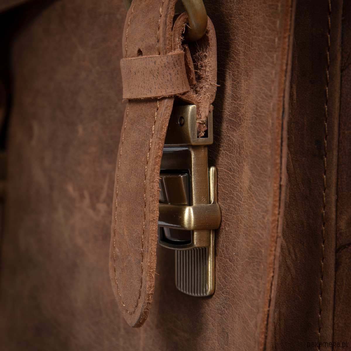 Okucia: Stalowe elementy w kolorze szczotkowanego antycznego złota, zapięcia na solidny karabińczyk i metalowe suwaki, które dodają elegancji.