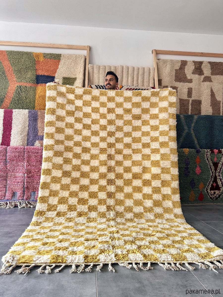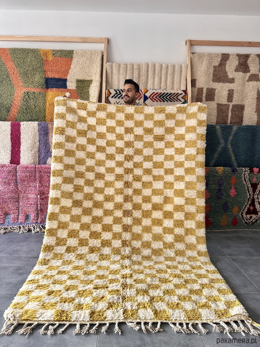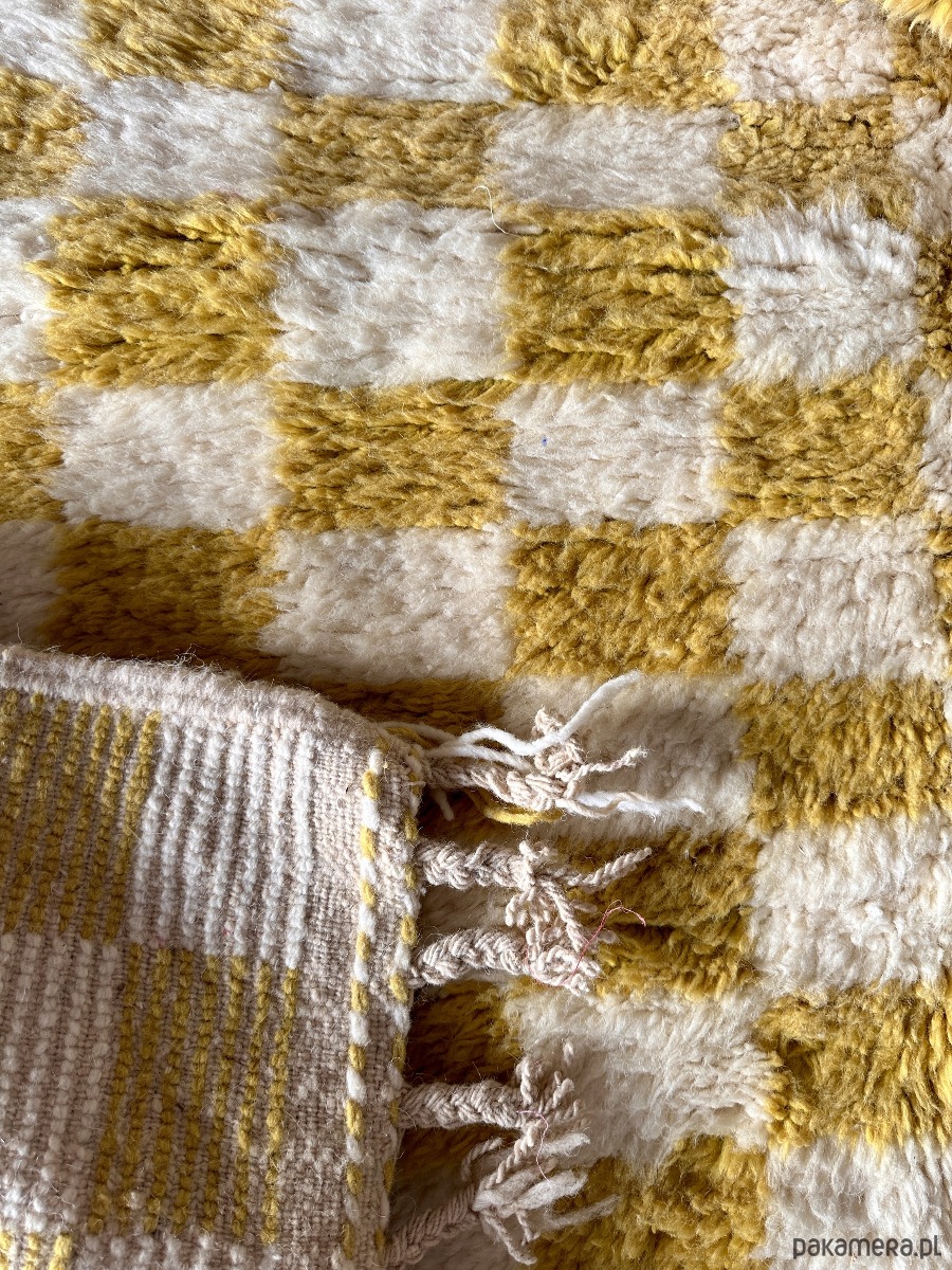 Ręcznie tkany, marokański dywan Beni Ourain Dama Shams to prawdziwe arcydzieło stworzone przez wykwalifikowanych rękodzielników w Górach Atlas w Maroku. Beni Ourain Dama Shams to połączenie tradycyjnego rzemiosła z nowoczesnym designem. Geometryczny wzór szachownicy w odcieniach bieli i żółtego wnosi wyrazistość do każdego wnętrza.