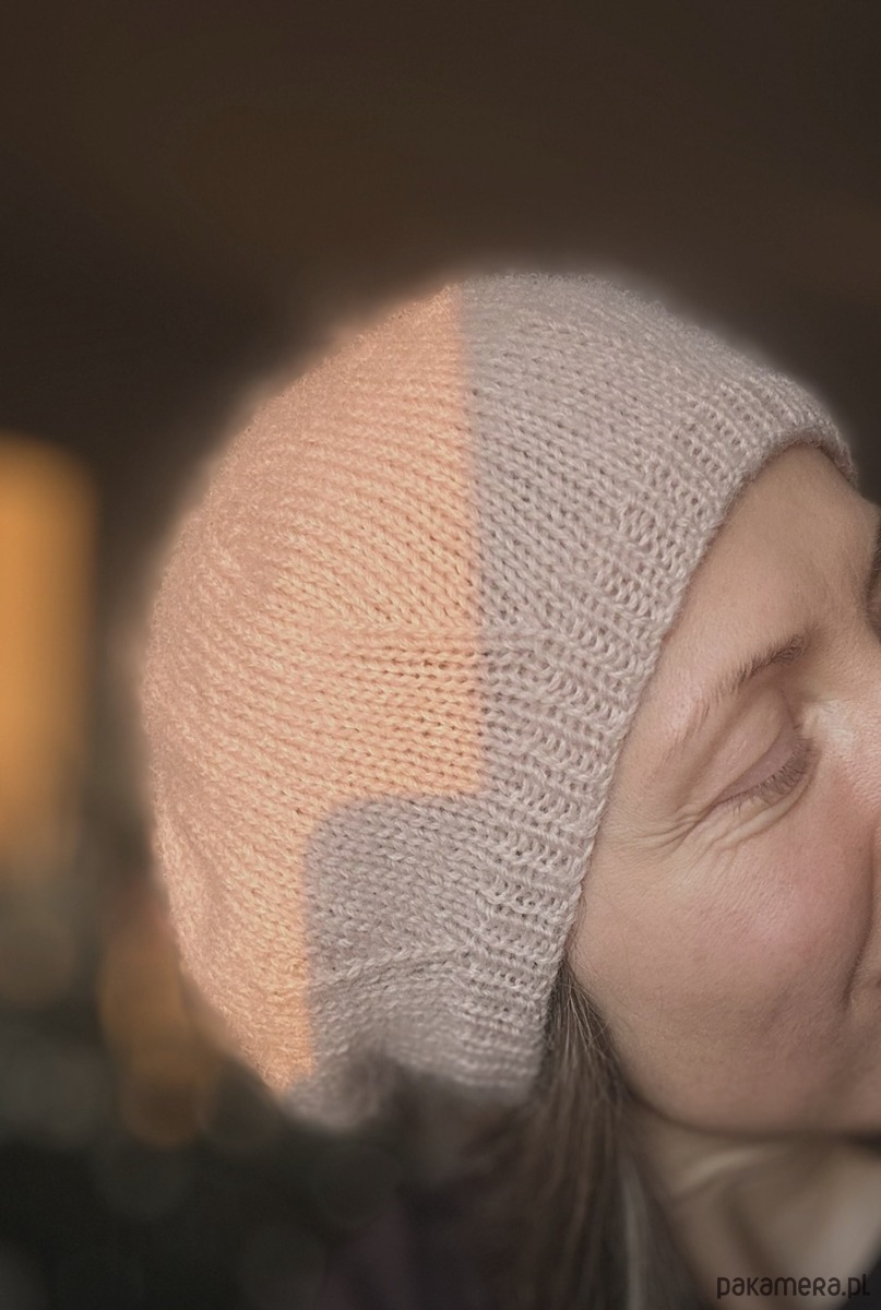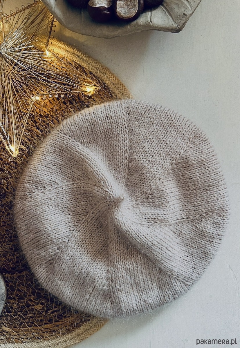 Beret z cudownej, delikatnej włóczki zawierającej wełnę merino, moher, jedwab, kaszmir. Kolor beżowy wpadający w delikatny róż. Robiony ręcznie.