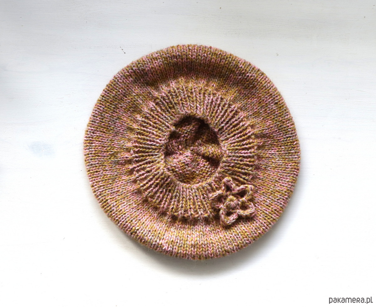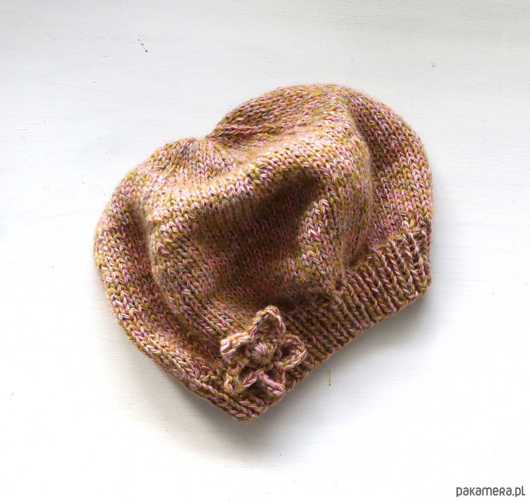 Beret z kwiatkiem zrobiony na drutach dziergany bezszwowy