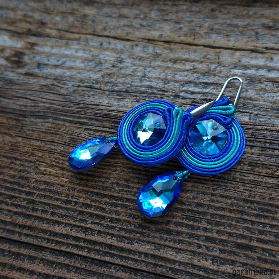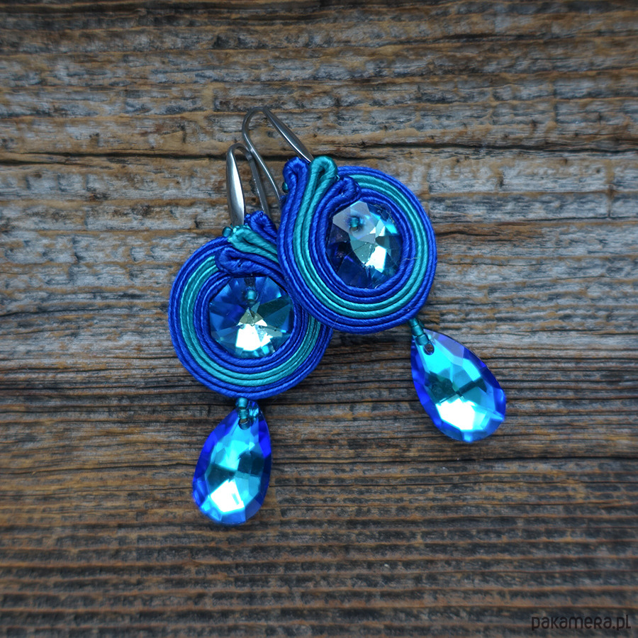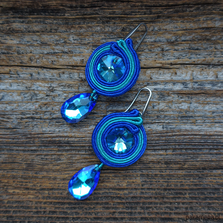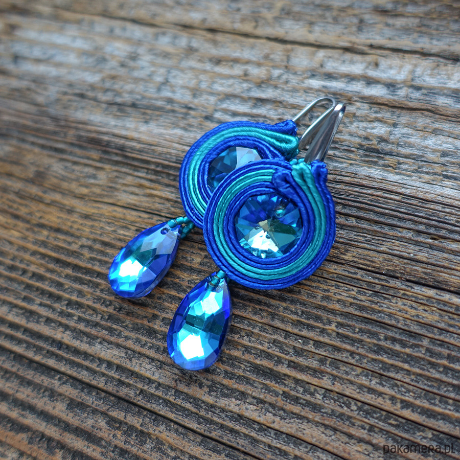 Zjawiskowe kolczyki wykonane w technice haftu soutache, w odcieniach głębokiego błękitu i szlachetnego turkusu. Centralny punkt stanowią kryształki w hipnotyzującym kolorze Bermuda Blue, które pięknie łapią światło przy każdym ruchu głowy ✨