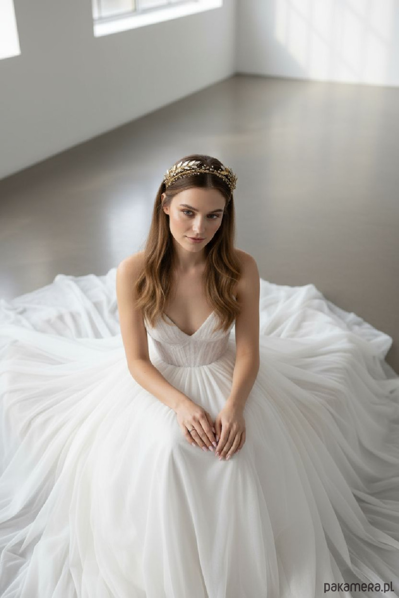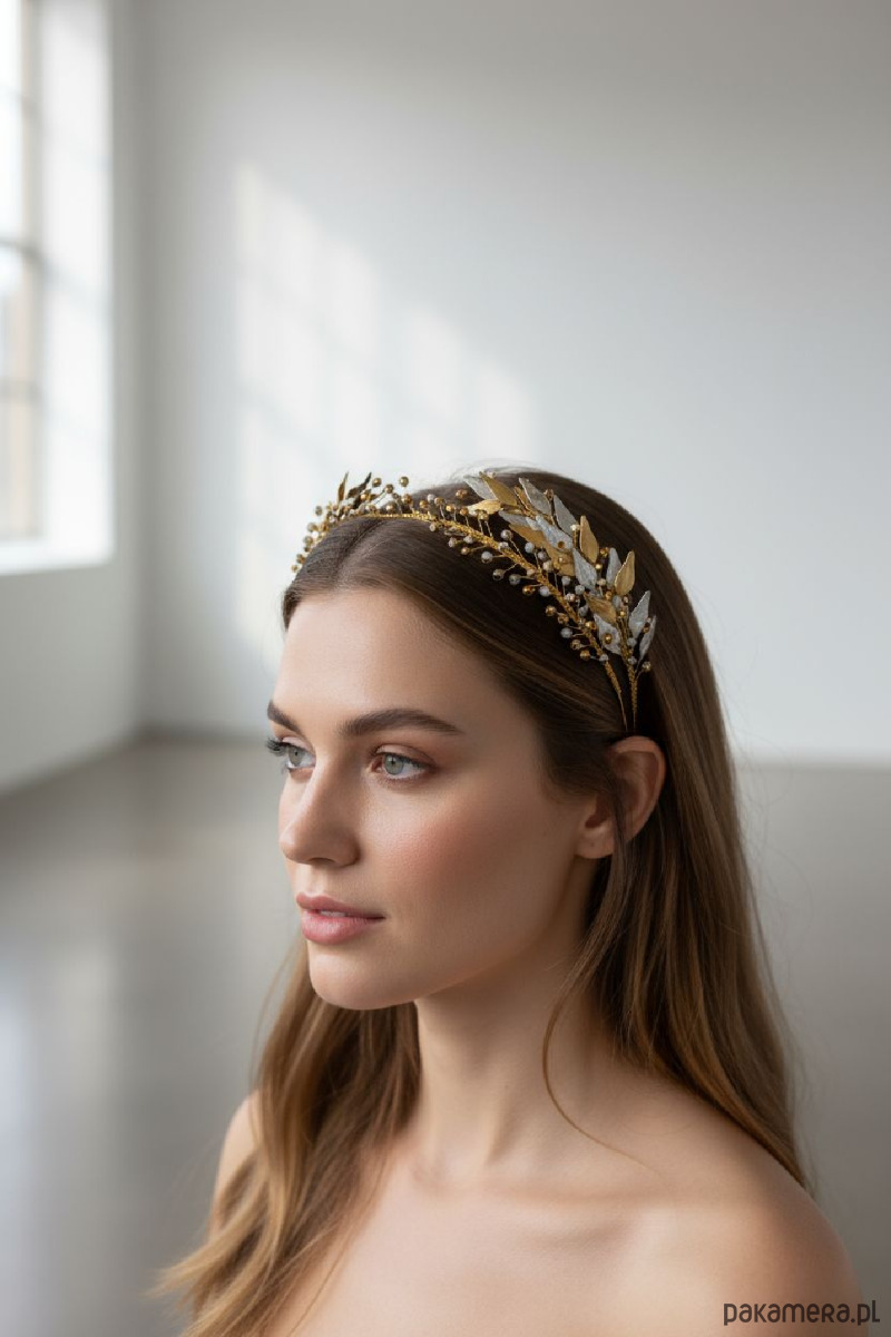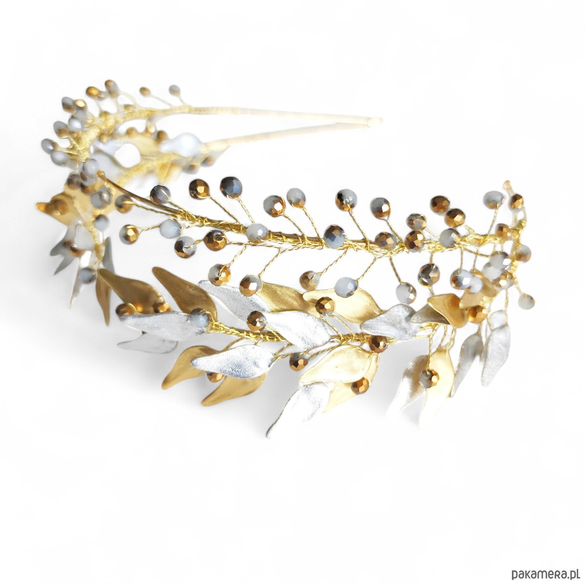 Niepowtarzalny wzór opaski ślubnej , na podwójnej złotej bazie . Przód opaski ze srebrzysto złotych szklanych czeskich koralików a druga część ze złoto srebrnych liści z żywicy. wszystkie elementy tworzone recznie. Ten projekt pasuje idealnie do wielu stylizacji. Metalowe elementy zabezpieczone specjalną powłoką przed utlenianiem.