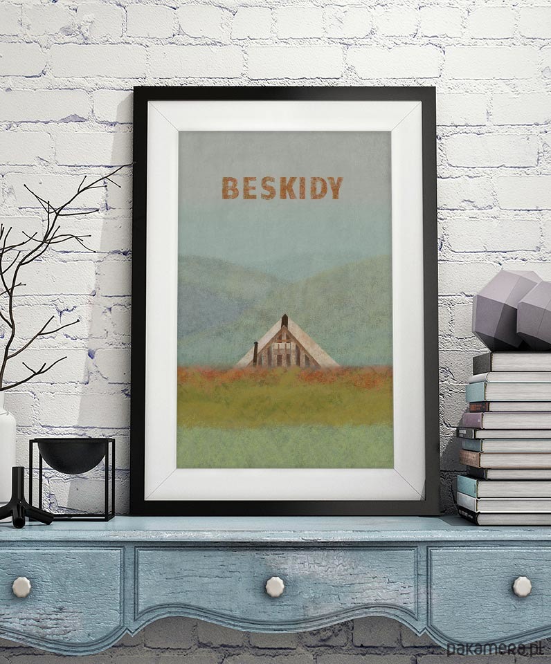 Plakat w stylu vintage przedstawiający jesienny dzień w Beskidach. Na pierwszym planie widnieje drewniany szałas pasterski, w tle nikną delikatnie zarysowane góry. Hala Mędralowa zaprezentowana jest w swojej jesiennej odsłonie, dominują ciepłe zielenie, czerwień i pomarańcz.