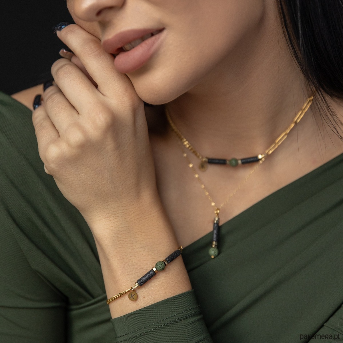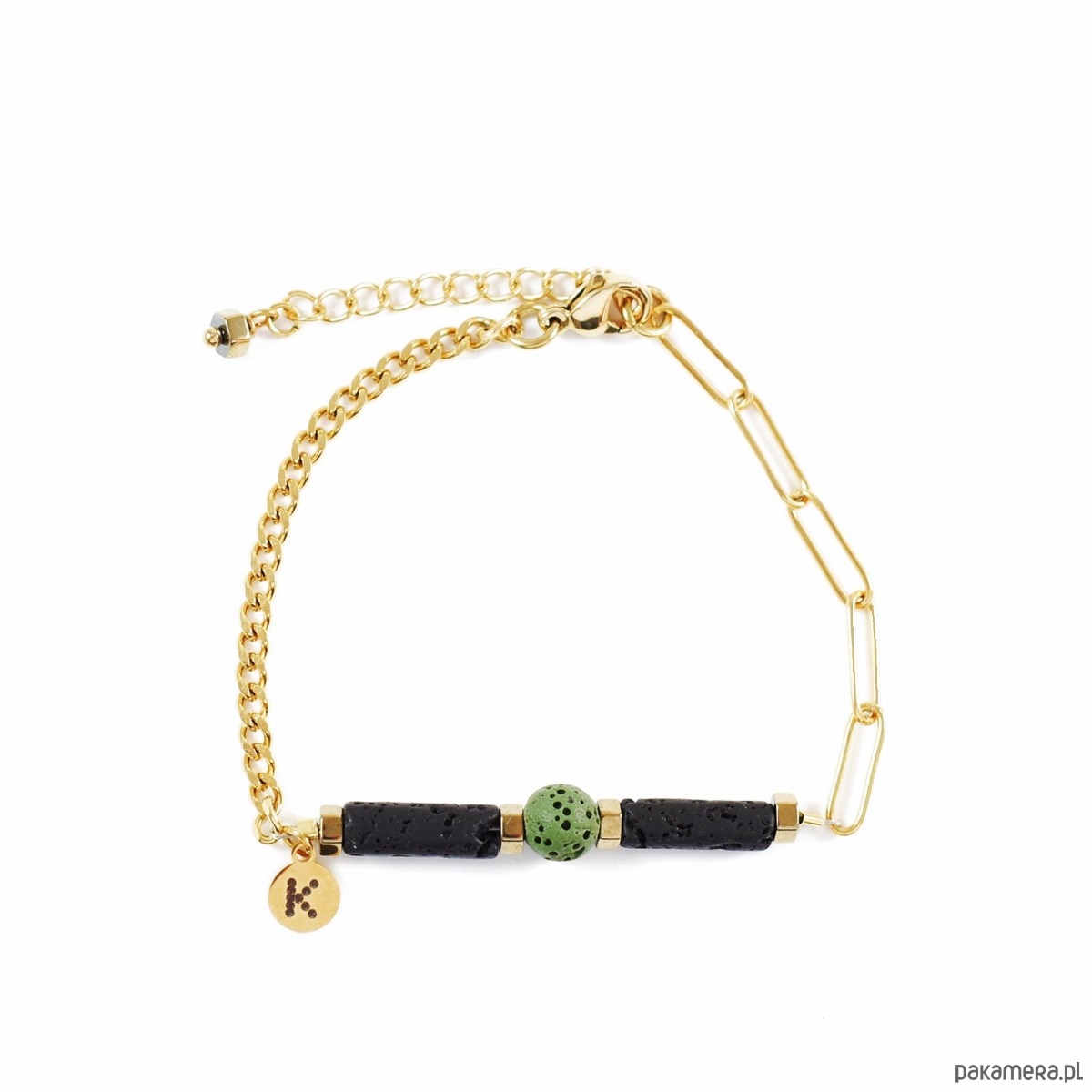 Tą pozłacaną bransoletkę wykonałyśmy z dwóch łańcuchów o różnych splotach i Lawy wulkanicznej w dwóch formach: położonej centralnie kulki Lawy wulkanicznej barwionej kwarcem na zielono oraz czarnej Lawy wulkanicznej o wyjątkowym kształcie i przekładek wykonanych z Hematytu.