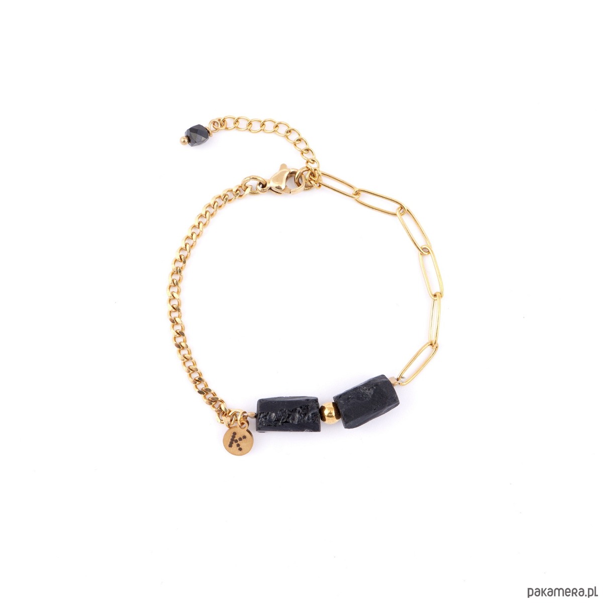 Podkręć swój look z naszą nową bransoletką. Pozłacaną bransoletkę wykonałyśmy z dwóch łańcuchów o różnych splotach, surowej bryły czarnego Turmalinu i oczka Hematytu.