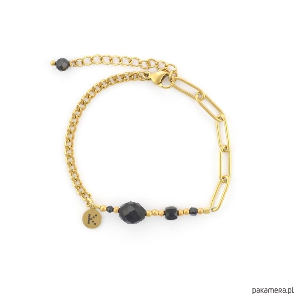 Bransoletka wykonana jest z antyalergicznej stali szlachetnej pozłacanej, która nie uczula. Bez obaw, pozłocenie pięknie się utrzymuje, nie ciemnieje i nie wyciera. Wymiary:Kamienie: Hematyt/Czarny TurmalinWielkość kamieni: 2mm/2mm,4mm,3mm,6x8mmGrubość splotu pancerki: ok. 2mm x 1mm Grubość łańcucha: 3mm x 6,5 mm x 0,5mm Długość bransoletki: standardowa ok 17,5cmBlaszka z logo: ok. 6mm Materiał: antyalergiczna stal chirurgiczna Rozmiar uniwersalny z możliwością regulacji za pomocą przedłużki.