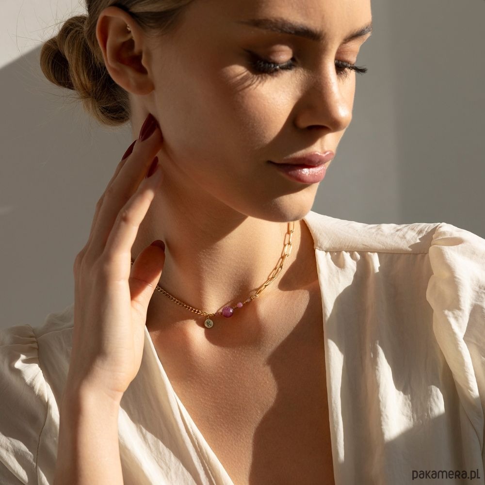 Naszyjnik wykonany jest z antyalergicznej stali szlachetnej pozłacanej, która nie uczula. Bez obaw, pozłocenie pięknie się utrzymuje, nie ciemnieje i nie wyciera.