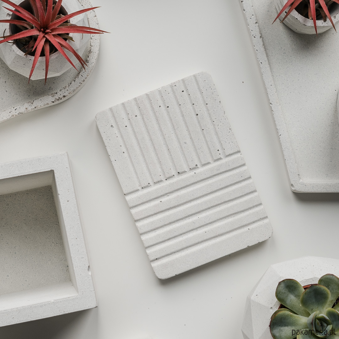 Szara, betonowa mydelniczka o minimalistycznym designie wykonana ręcznie. Każda mydelniczka została pokryta ochronną warstwą wodoodpornego impregnatu , a na jej spodzie umieściliśmy silikonowe podkładki, aby nie rysowała powierzchni.