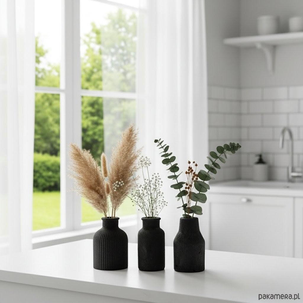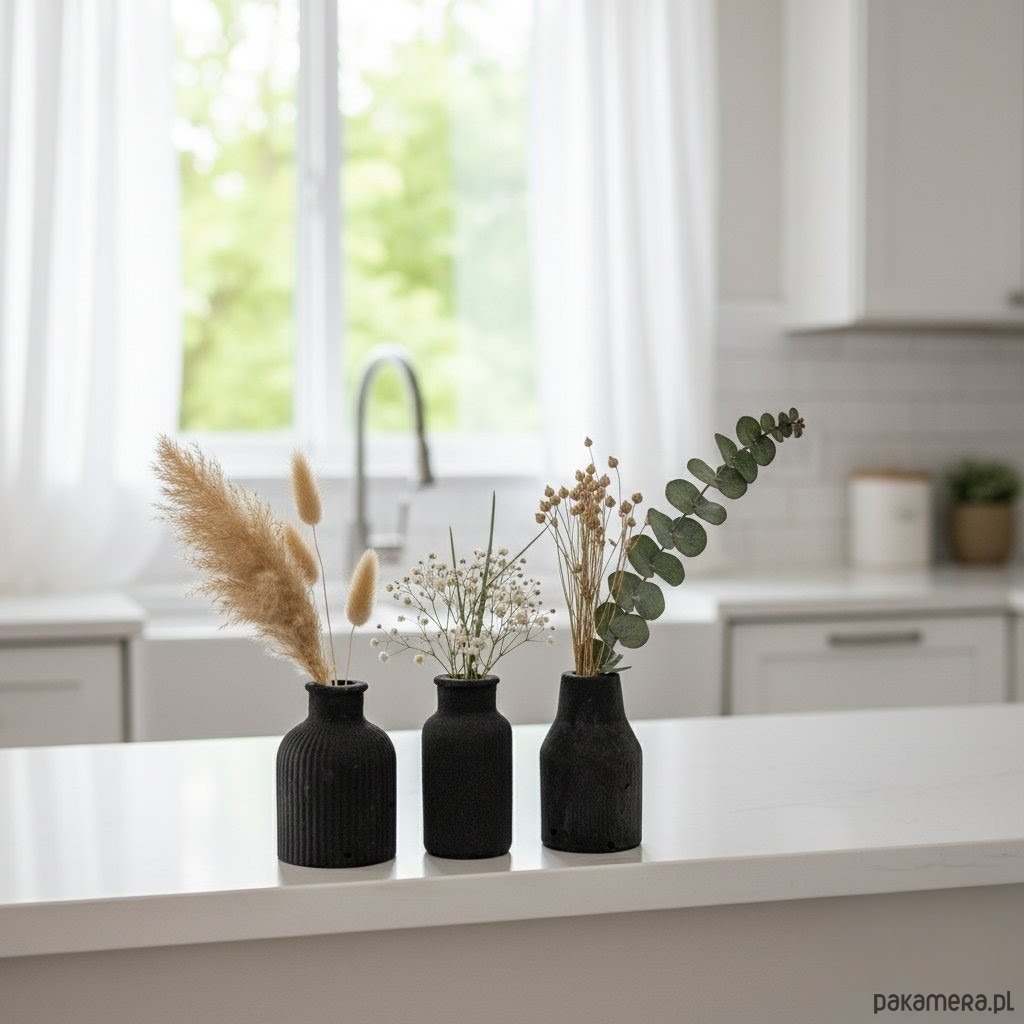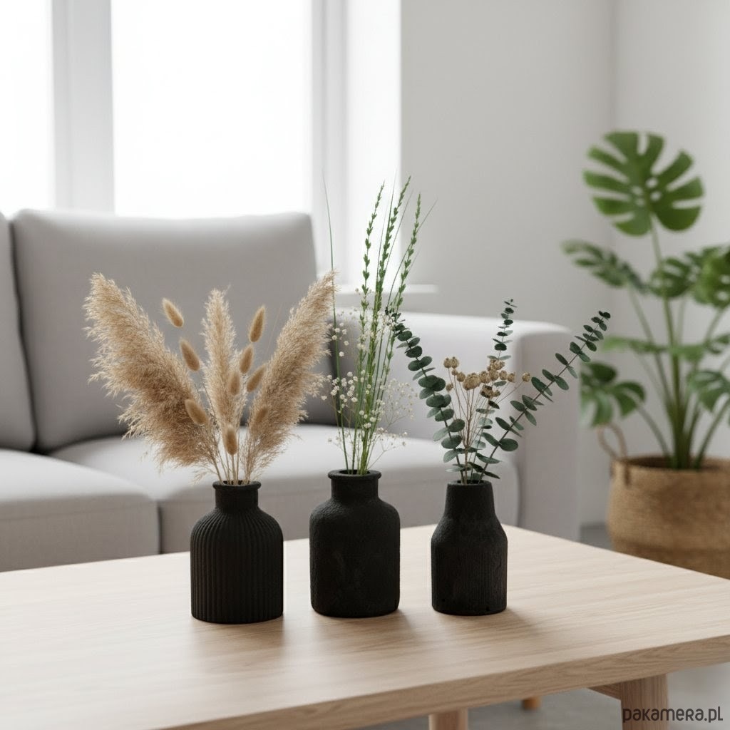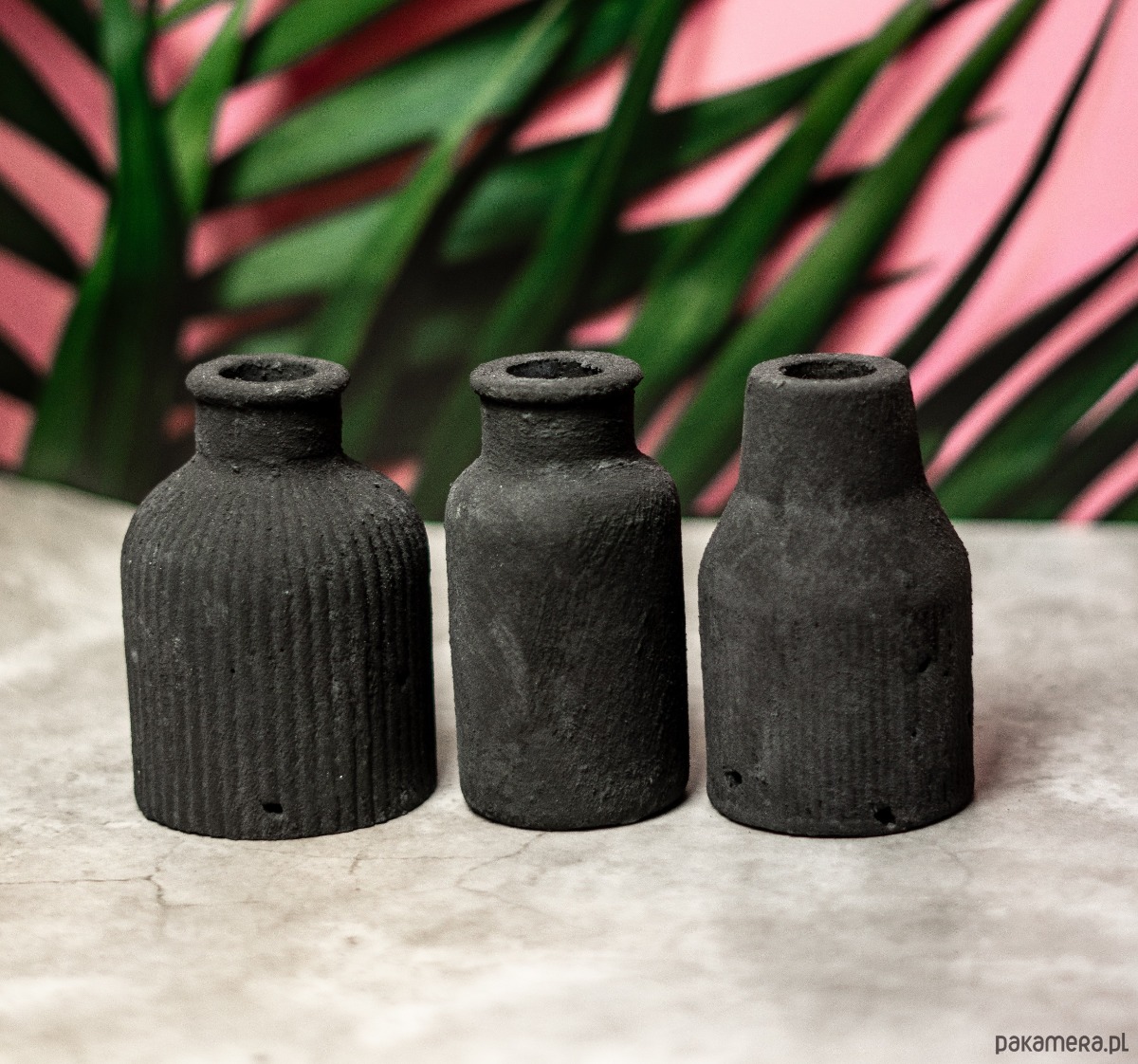 Ręcznie robione mini wazony z betonu w kolorze czarnym z efektem surowej ceramiki. Odpowiednie proporcje cementu i dodatków pozwoliły uzyskać idealny kolor, a zarazem wytrzymałość. Proces obróbki wykonywany jest ręcznie, bez wykorzystania maszyn. Produkt jest zabezpieczony specjalną mieszanką nadającą wytrzymałość, a na samym końcu specjalnym lakierem. Każdy nasz produkt jest inny, nie jest produkowany seryjnie, co nadaje mu niepowtarzalność.