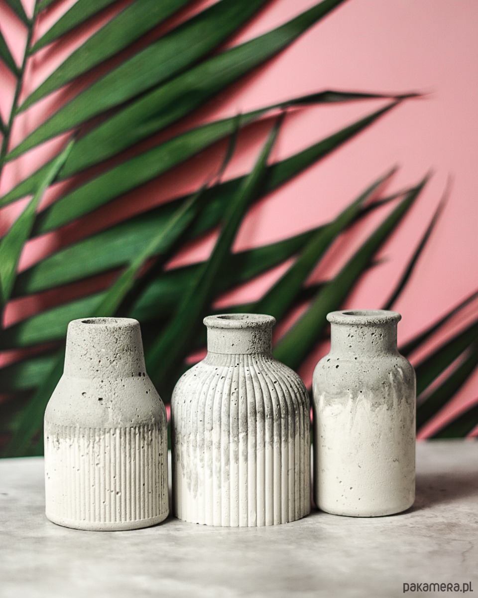 Ręcznie robione mini wazony z betonu w kolorze szarym i kremowym. Odpowiednie proporcje cementu i dodatków pozwoliły uzyskać idealny kolor, a zarazem wytrzymałość. Proces obróbki wykonywany jest ręcznie, bez wykorzystania maszyn. Produkt jest zabezpieczony specjalną mieszanką nadającą wytrzymałość, a na samym końcu specjalnym lakierem. Każdy nasz produkt jest inny, nie jest produkowany seryjnie, co nadaje mu niepowtarzalność.