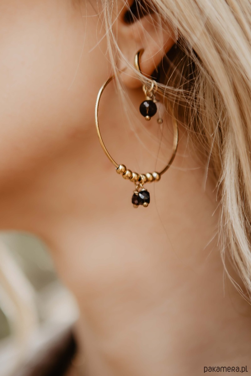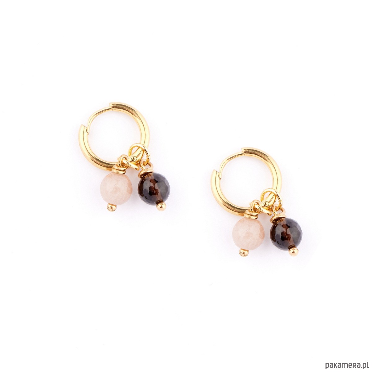Poznaj nasze ponadczasowe pozłacane kolczyki koła z zawieszką z dwóch kamieni: Kwarcu dymnego i Kamienia słonecznego. Całość tworzy kolczyki, które będą pasować do każdej Twojej stylizacji.