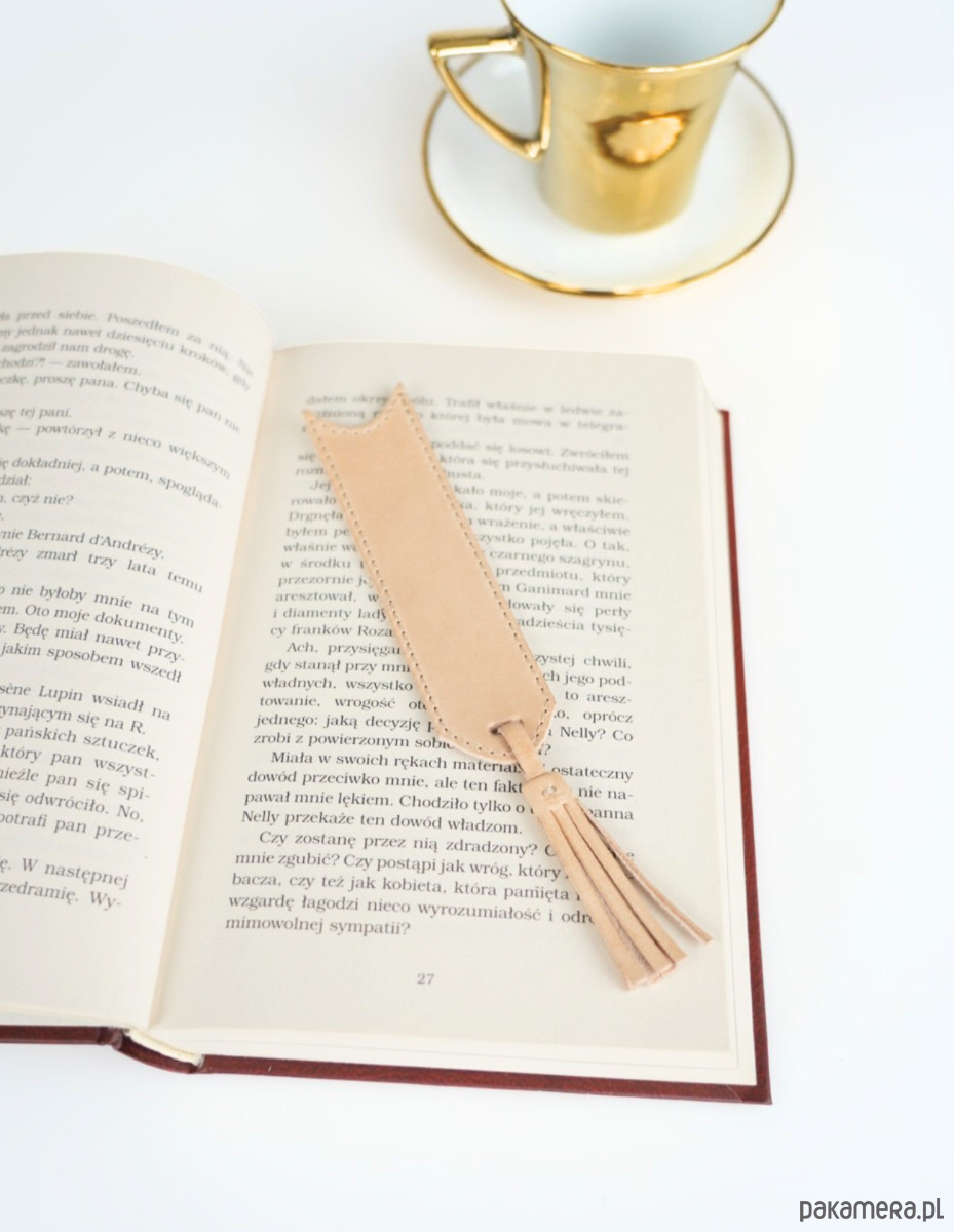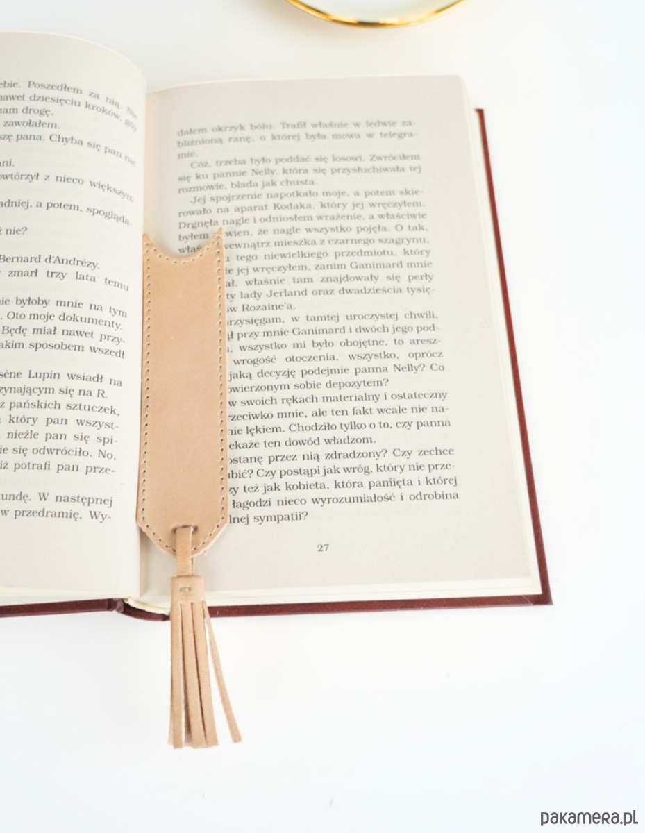 -Beżowa zakładka ze skóry juchtowej – klasyczna, elegancka, nabiera szlachetnej patyny z każdym dniem użytkowania.