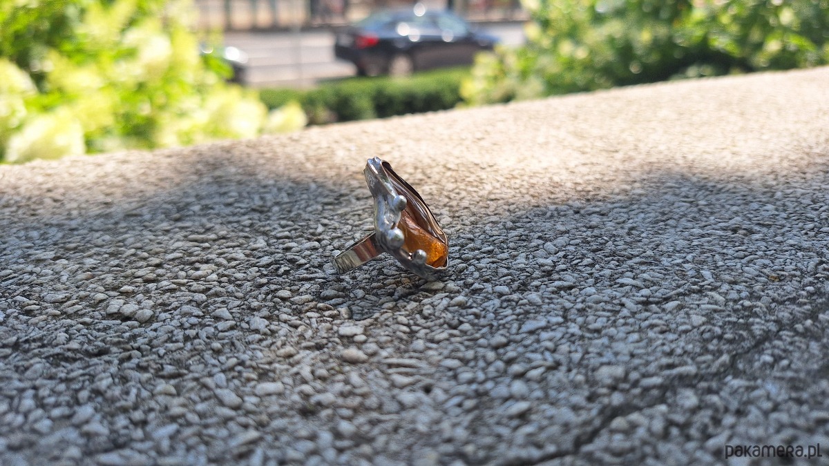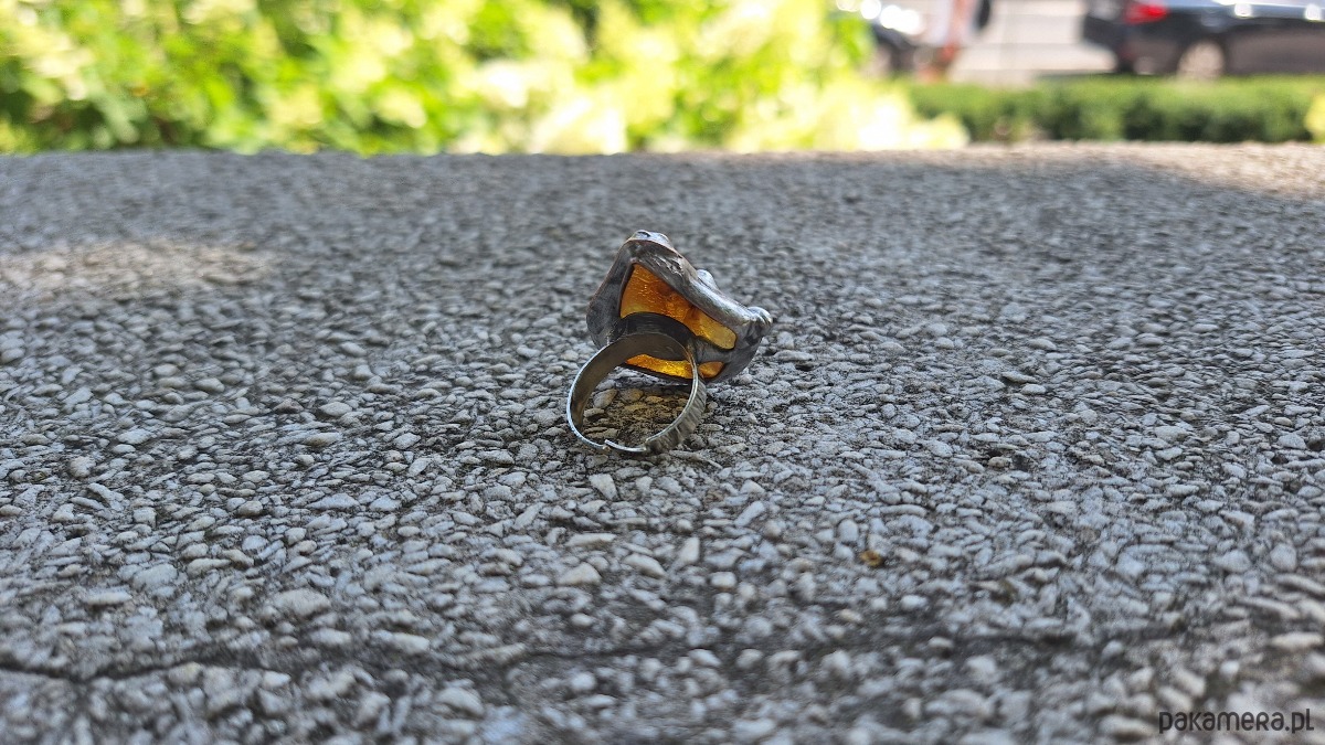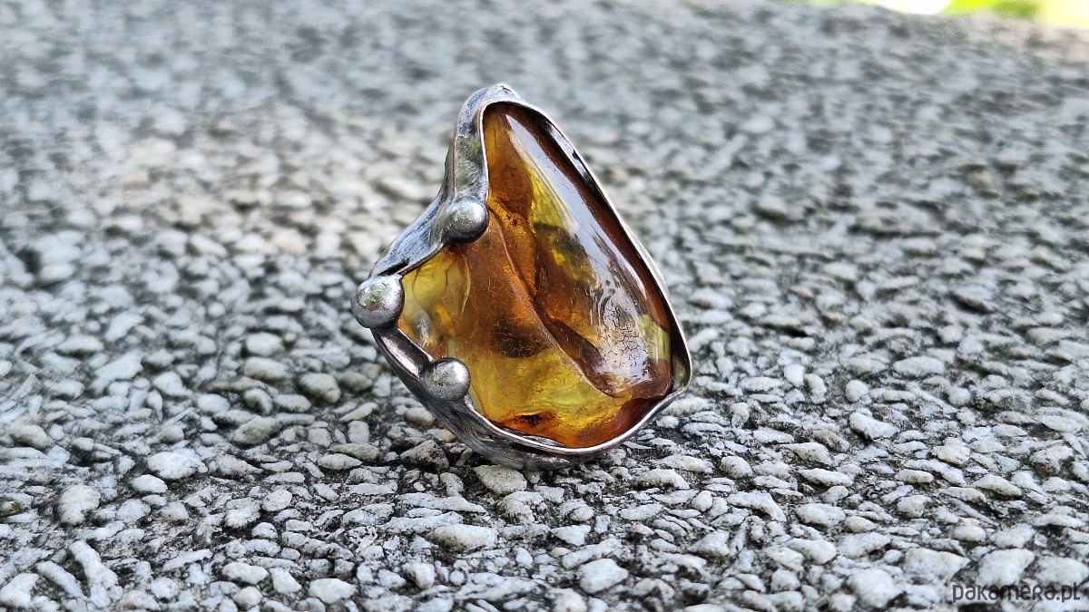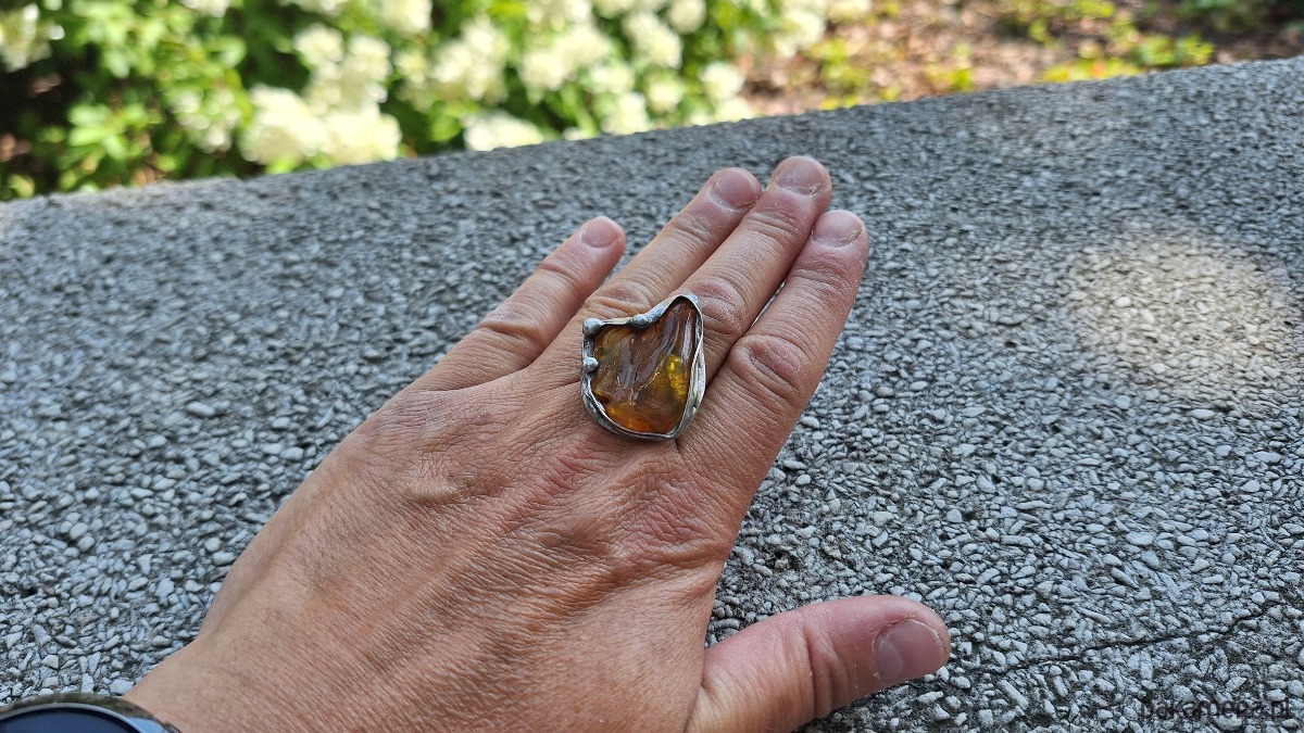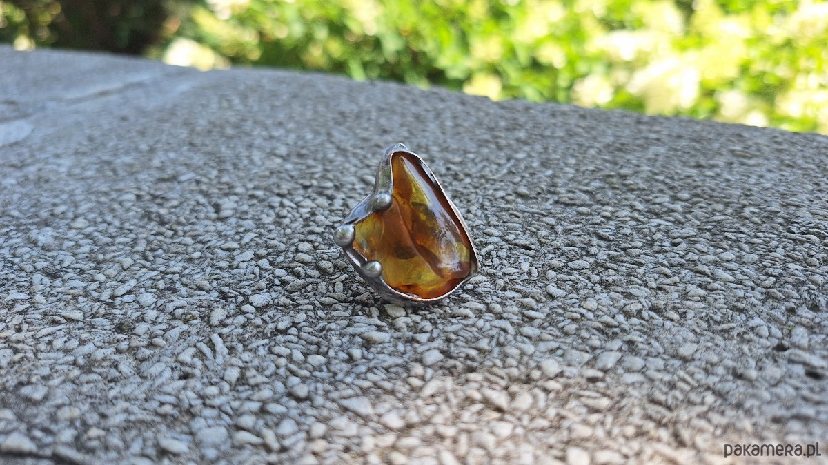 Pierścionek wykonany z miedzi, cyny i bursztynu. Wymiary ok. 3 na 2.5 cm. Regulowany. Nie jest ciężki.