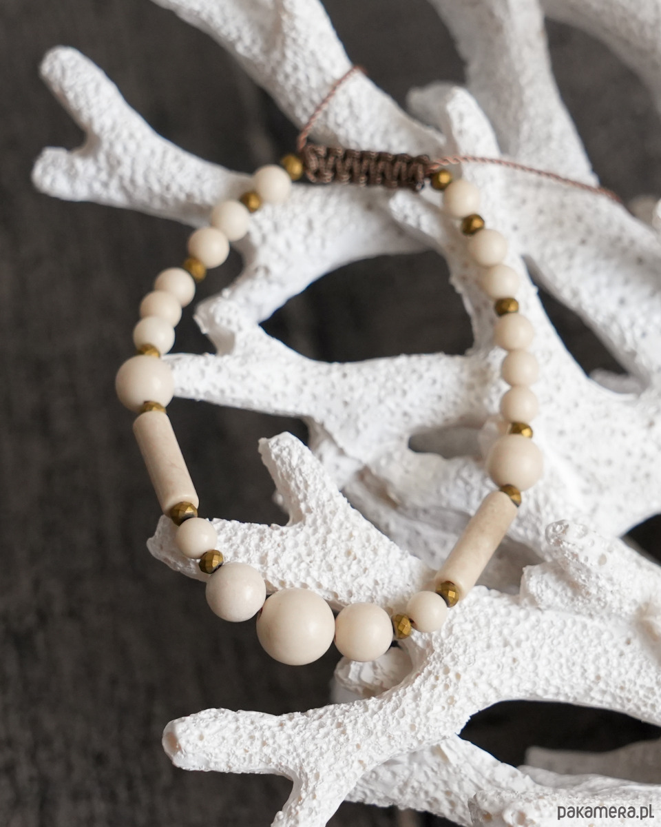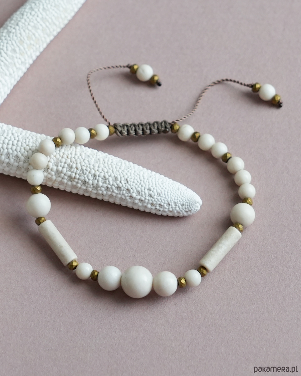 Bransoletka na sznureczku z beżowego KAMIENIA RZECZNEGO oraz matowego HEMATYTU w kolorze starego złota. Dzięki przesuwanemu "zapięciu" wykonanemu w technice makramy bransoletka jest regulowana i ma uniwersalny rozmiar.