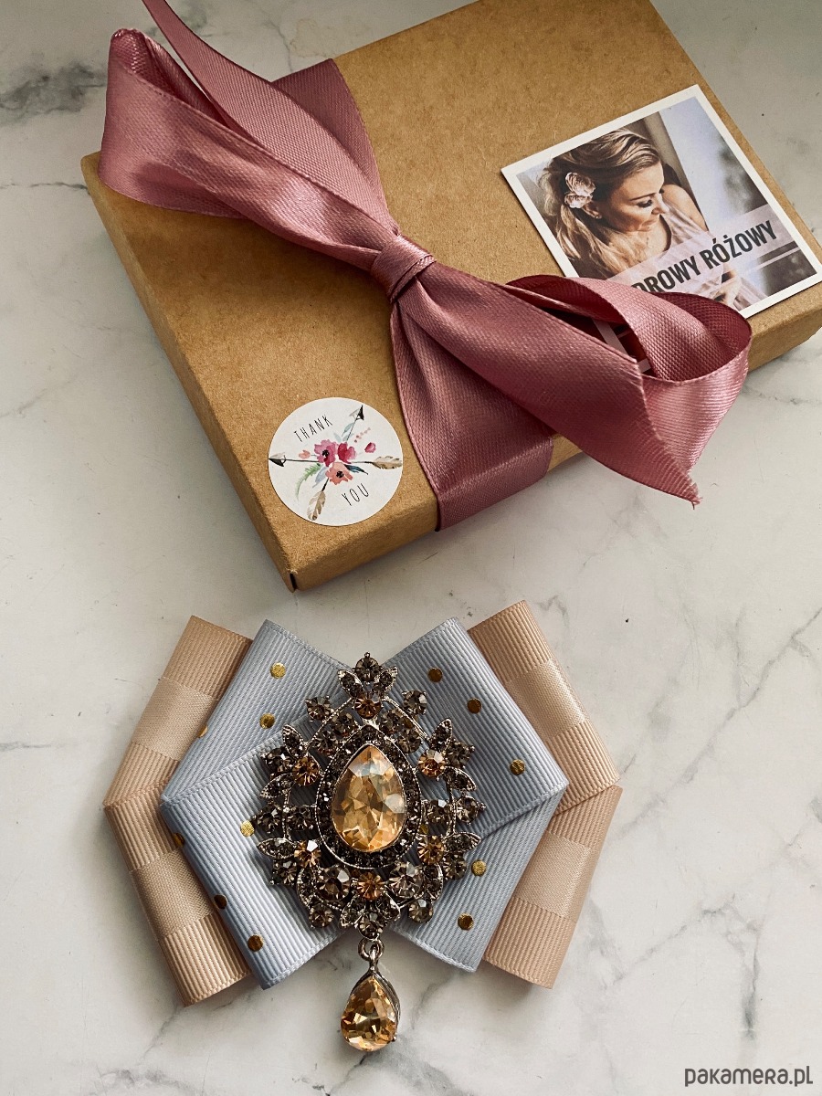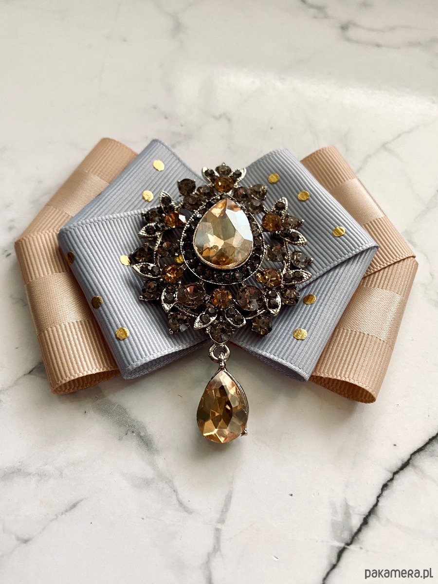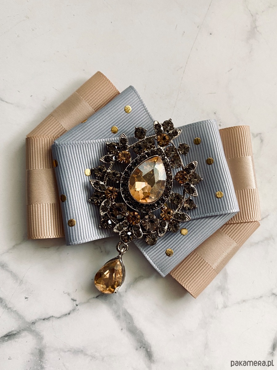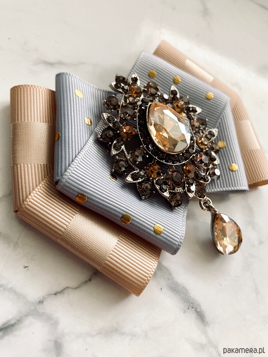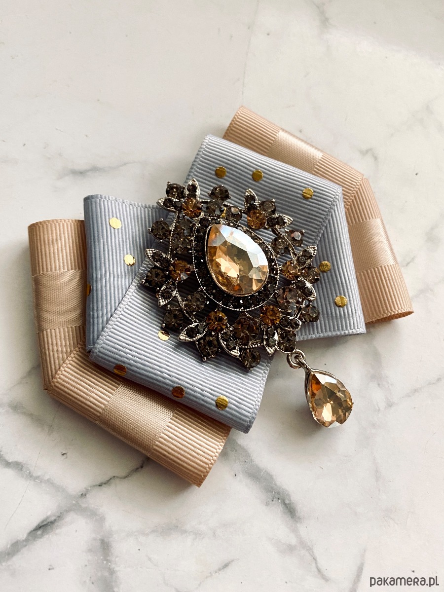Broszka wykonana z wysokiej jakości taśm i dodatków. Brosza w kolorze szlachetnego beżu i delikatnej szarości. Na środku imponująca ażurowa ozdoba biżuteryjna z kryształami w kolorze szampanskim. Brosza stworzona z myślą o kobietach delikatnych o klasycznej urodzie. Będzie idealnie pasować zarówno do koszul, bluzek, swetrów, sukienek, żakietów oraz do płaszczy, kurtek, szali i chust. Idealna do każdej stylizacji, zarówno do sportowej jak również do eleganckich stylizacji.