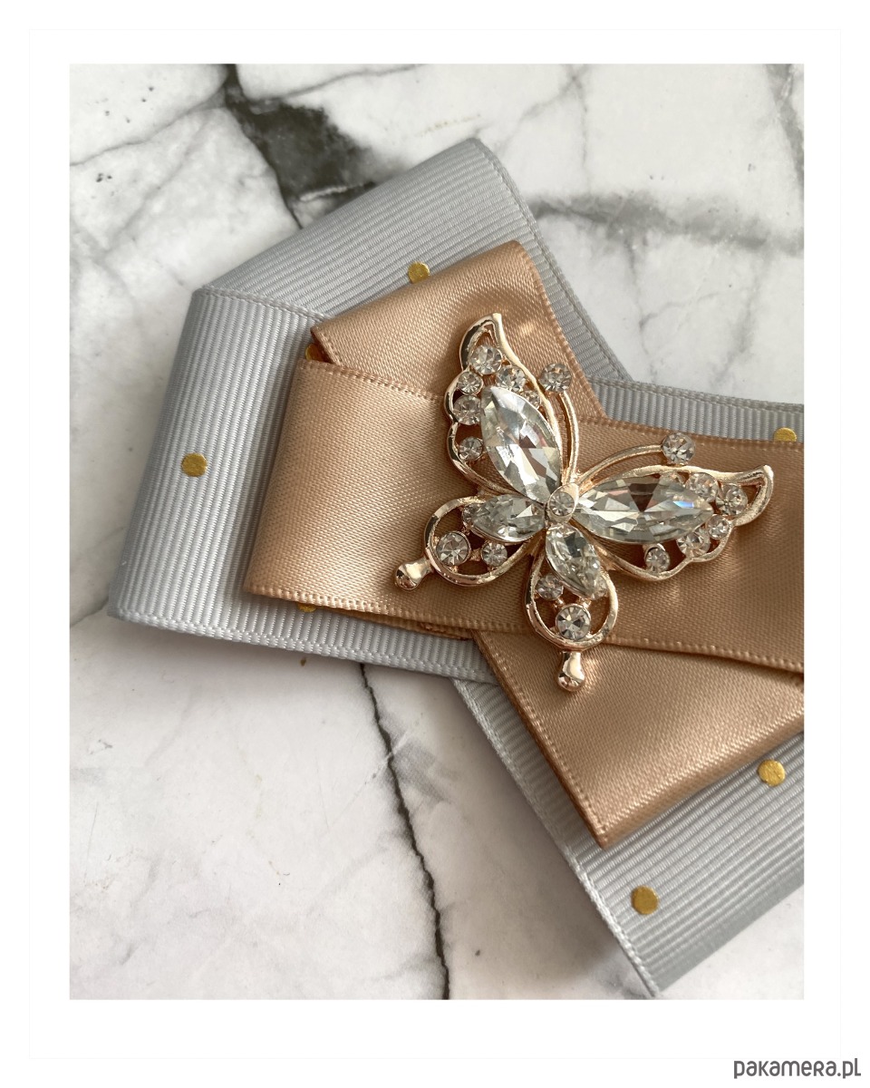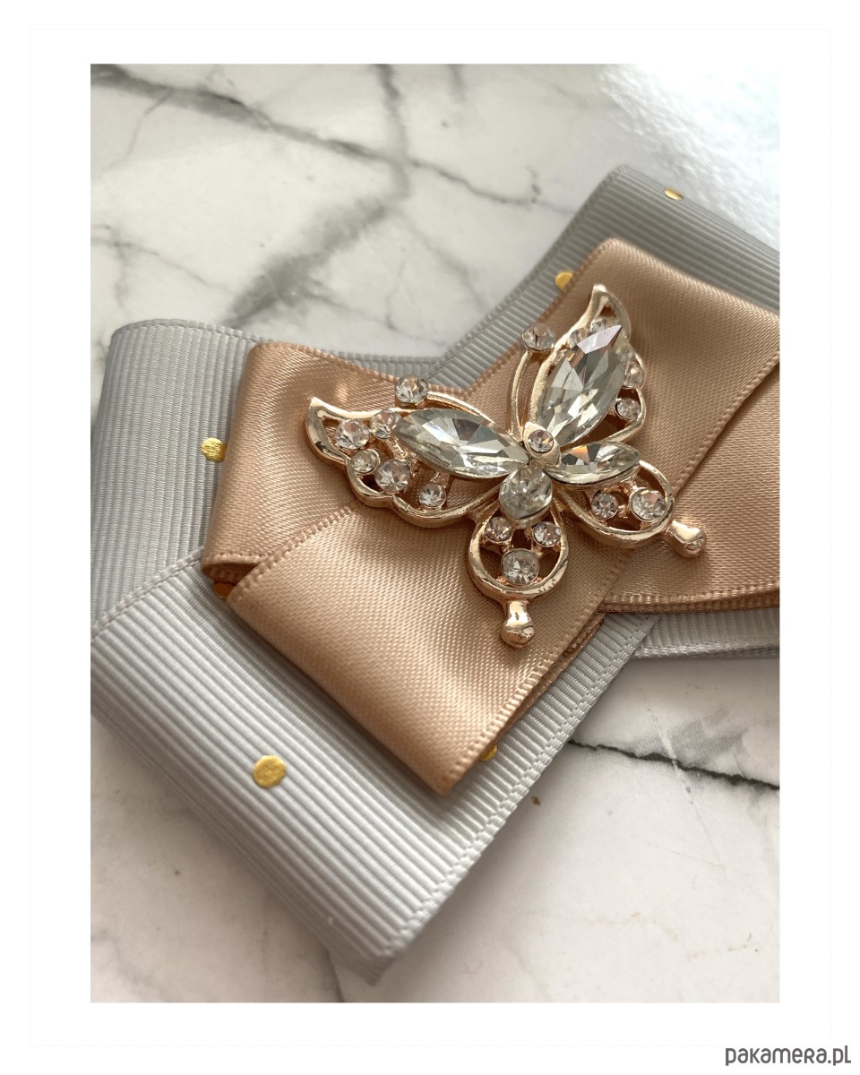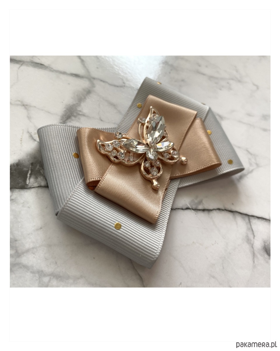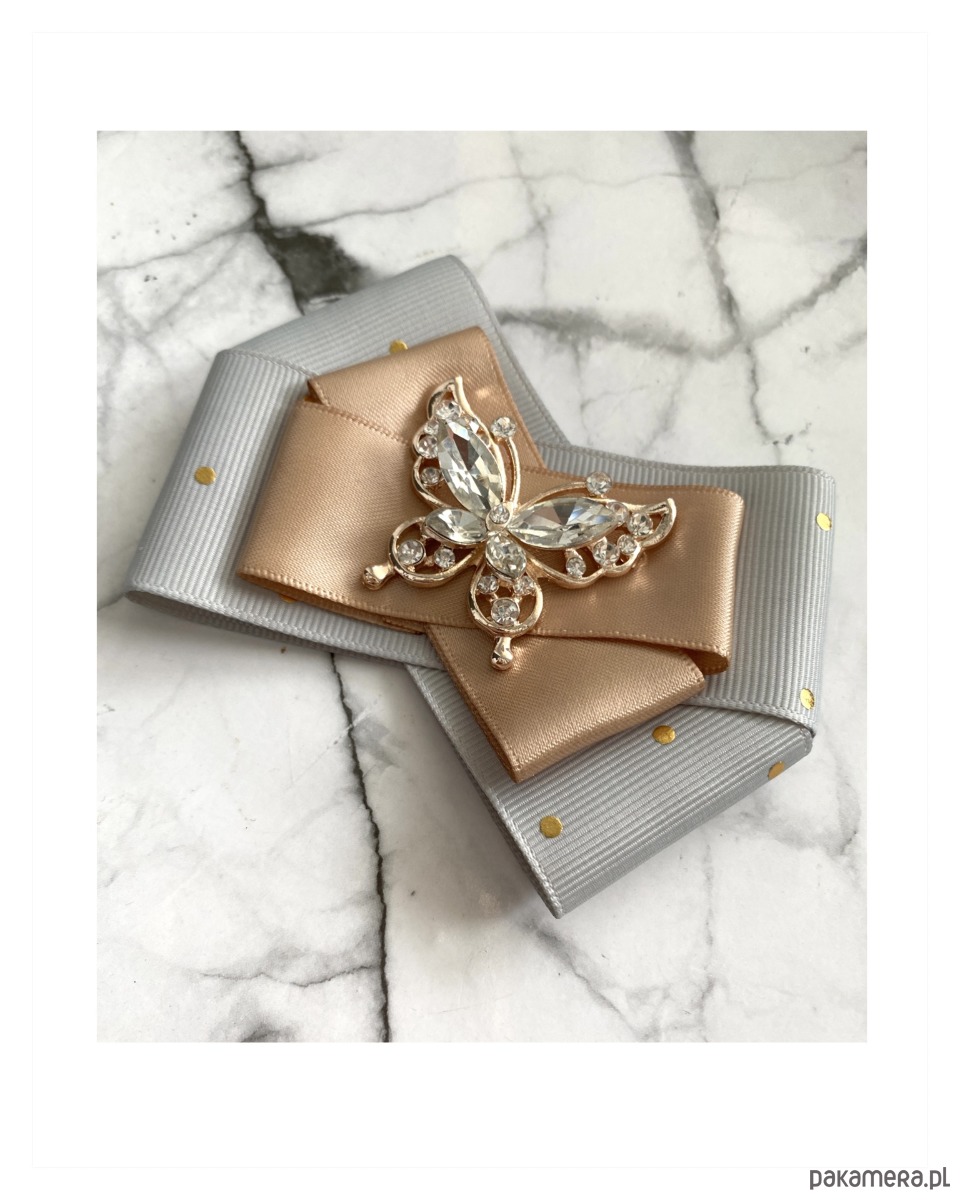 Broszka wykonana z wysokiej jakości taśm i dodatków. Brosza w kolorze szlachetnego beżu i delikatnej szarości.