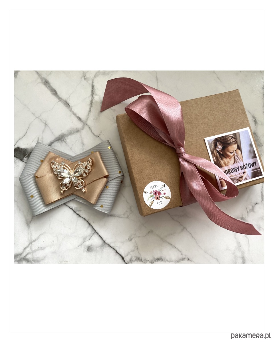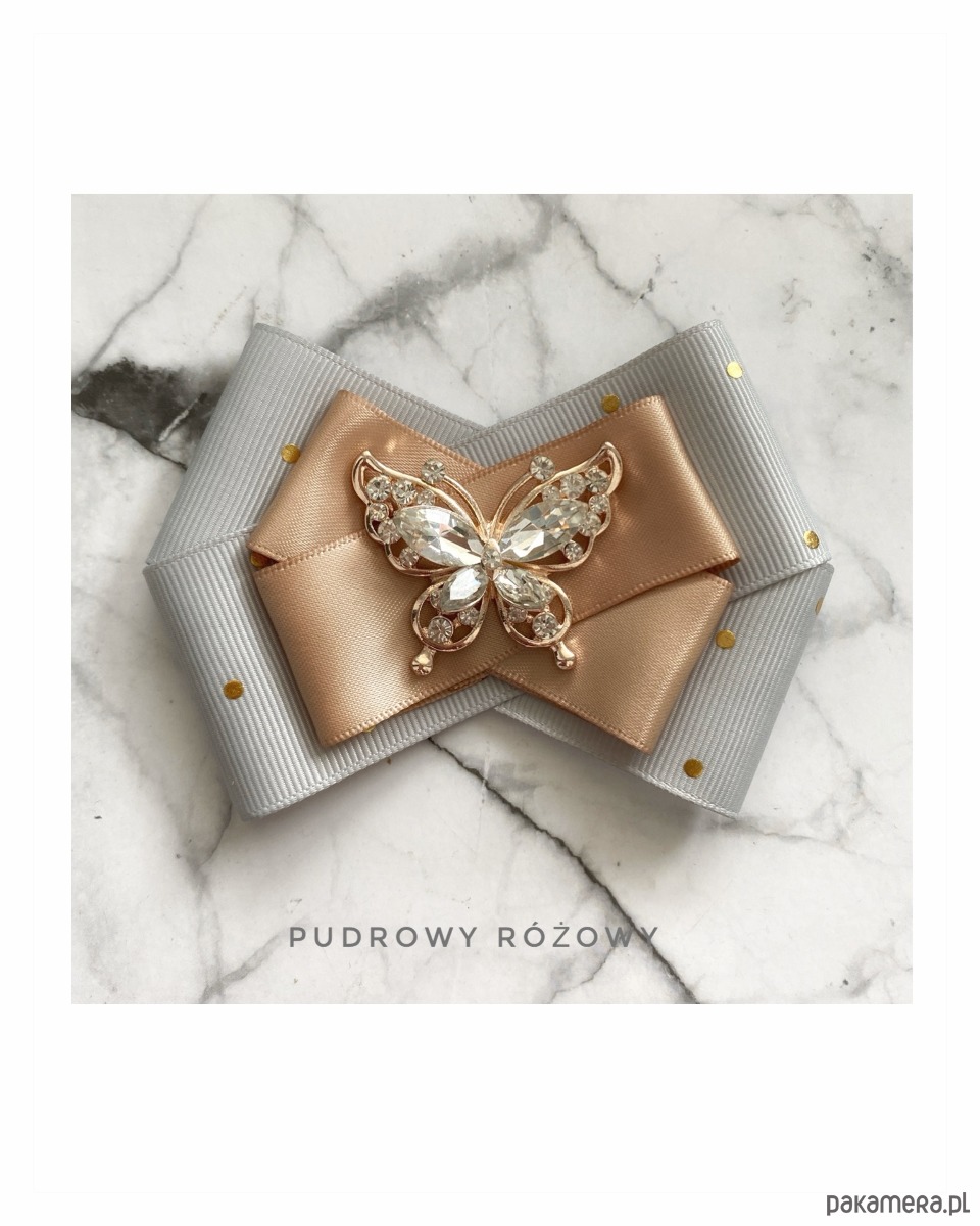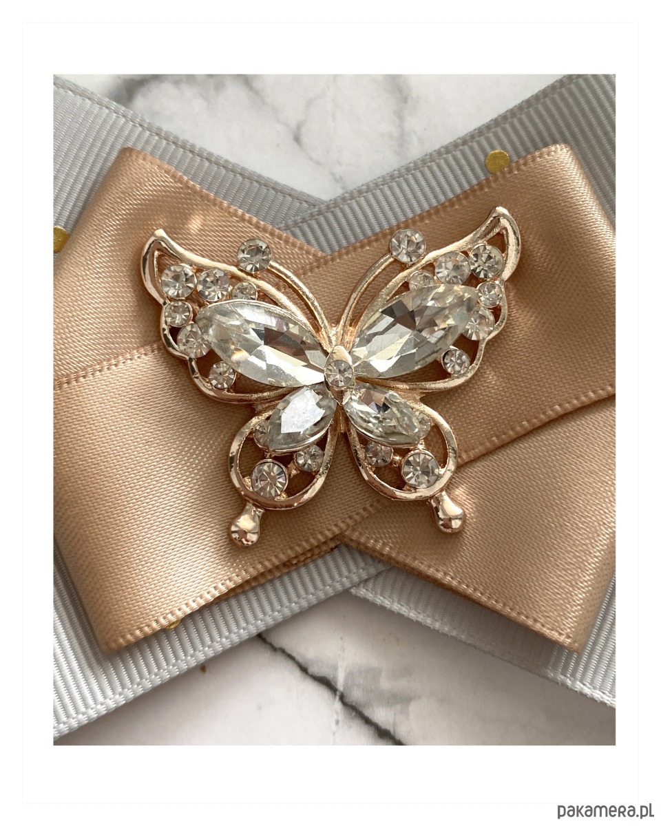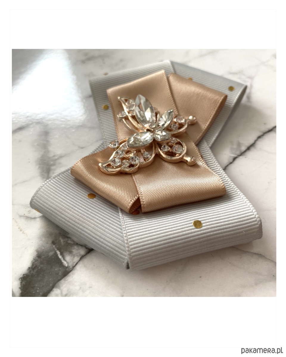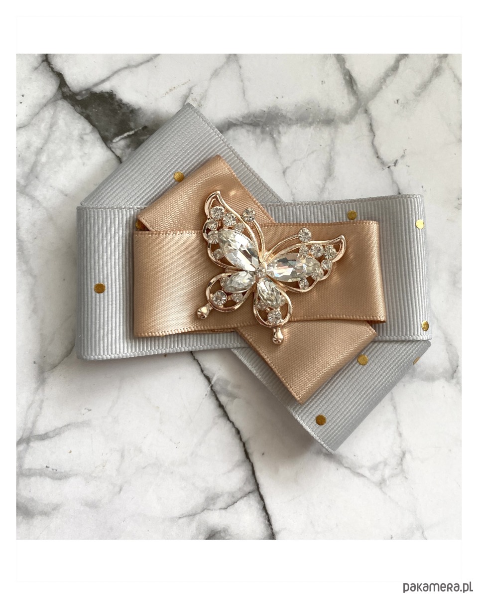 Broszka wykonana z wysokiej jakości taśm i dodatków. Brosza w kolorze szlachetnego beżu i delikatnej szarości.
