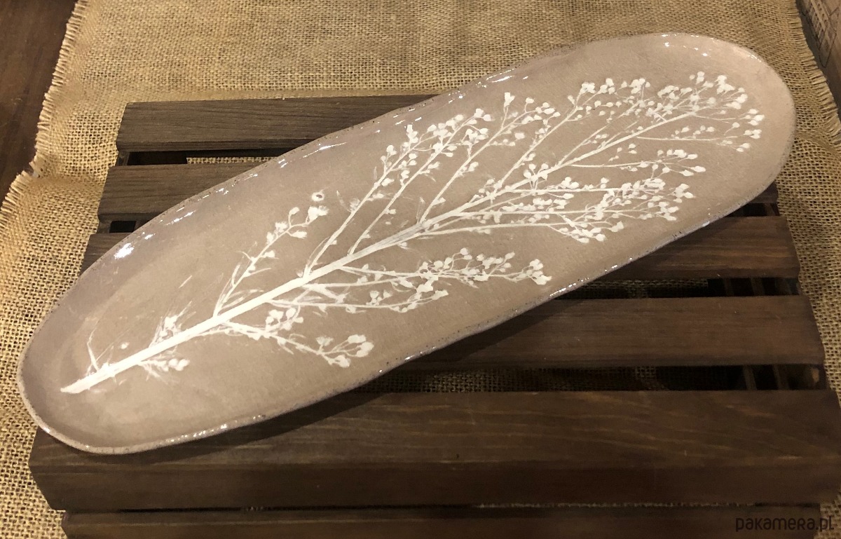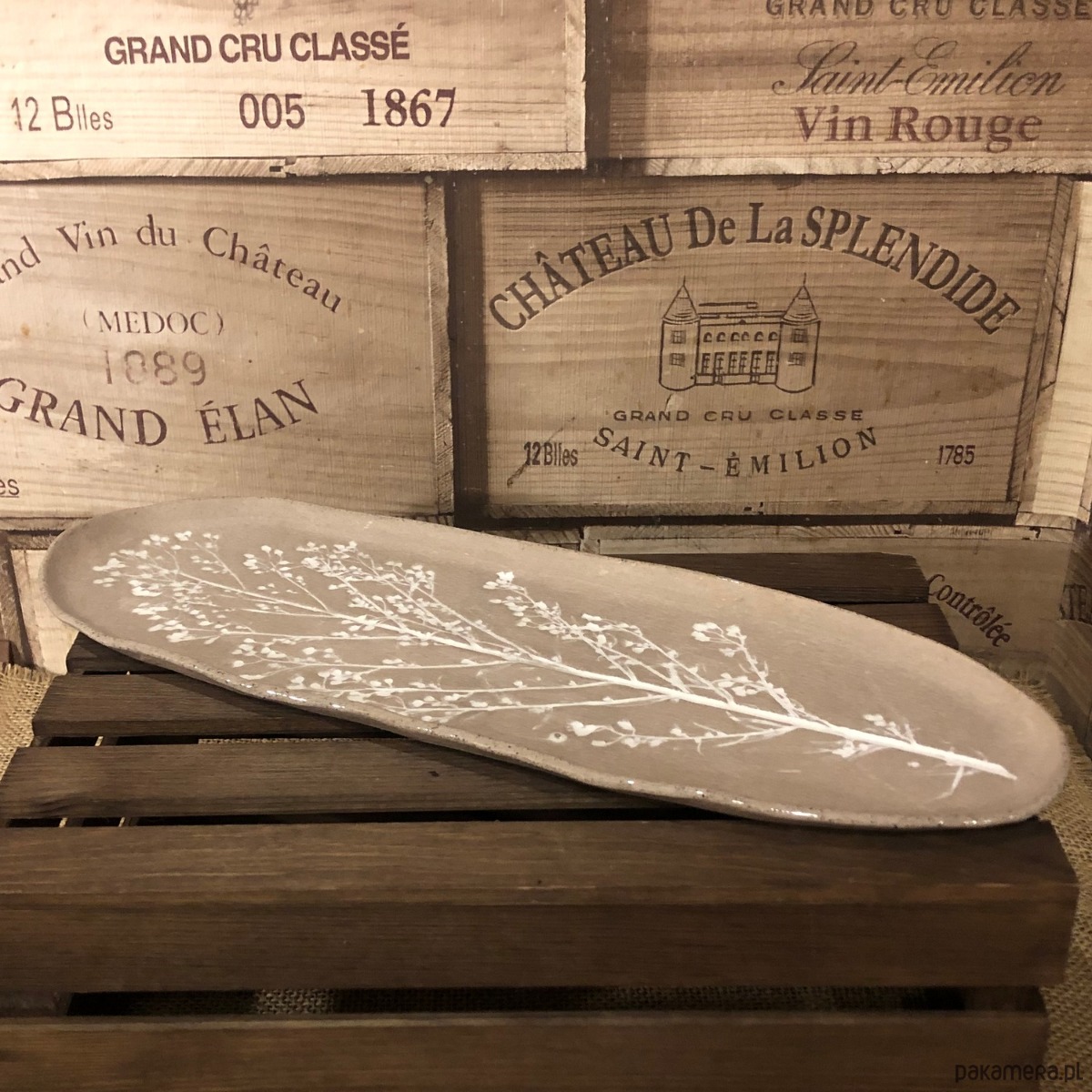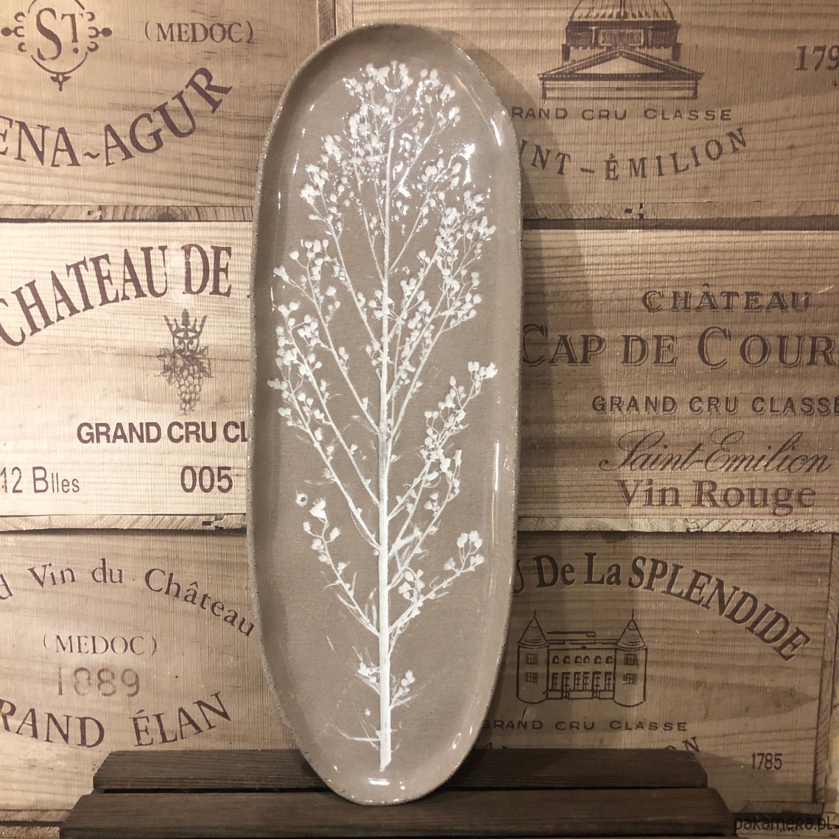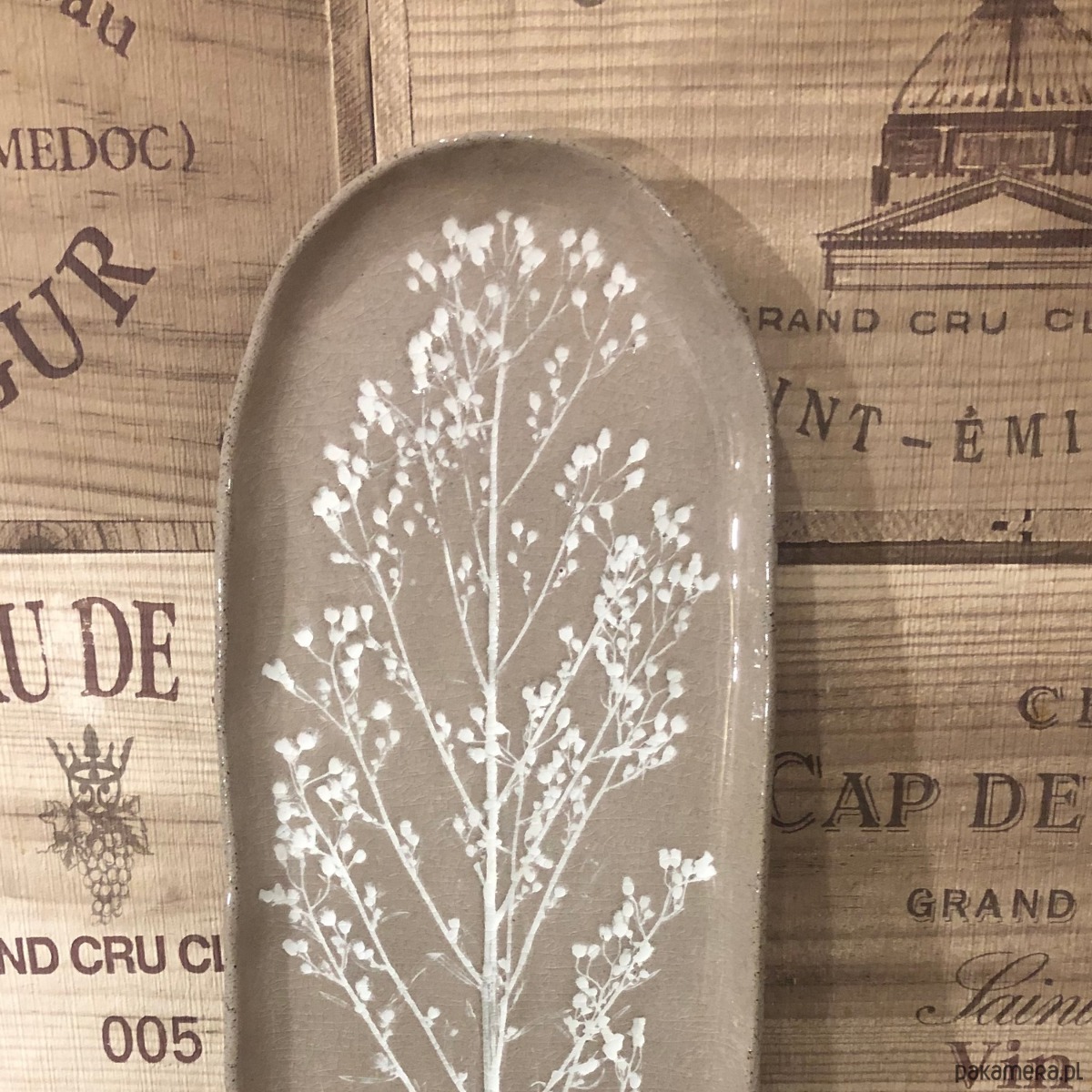 Patera w kolorze beżowym z odbitym naturalnym polnym kwiatem.
