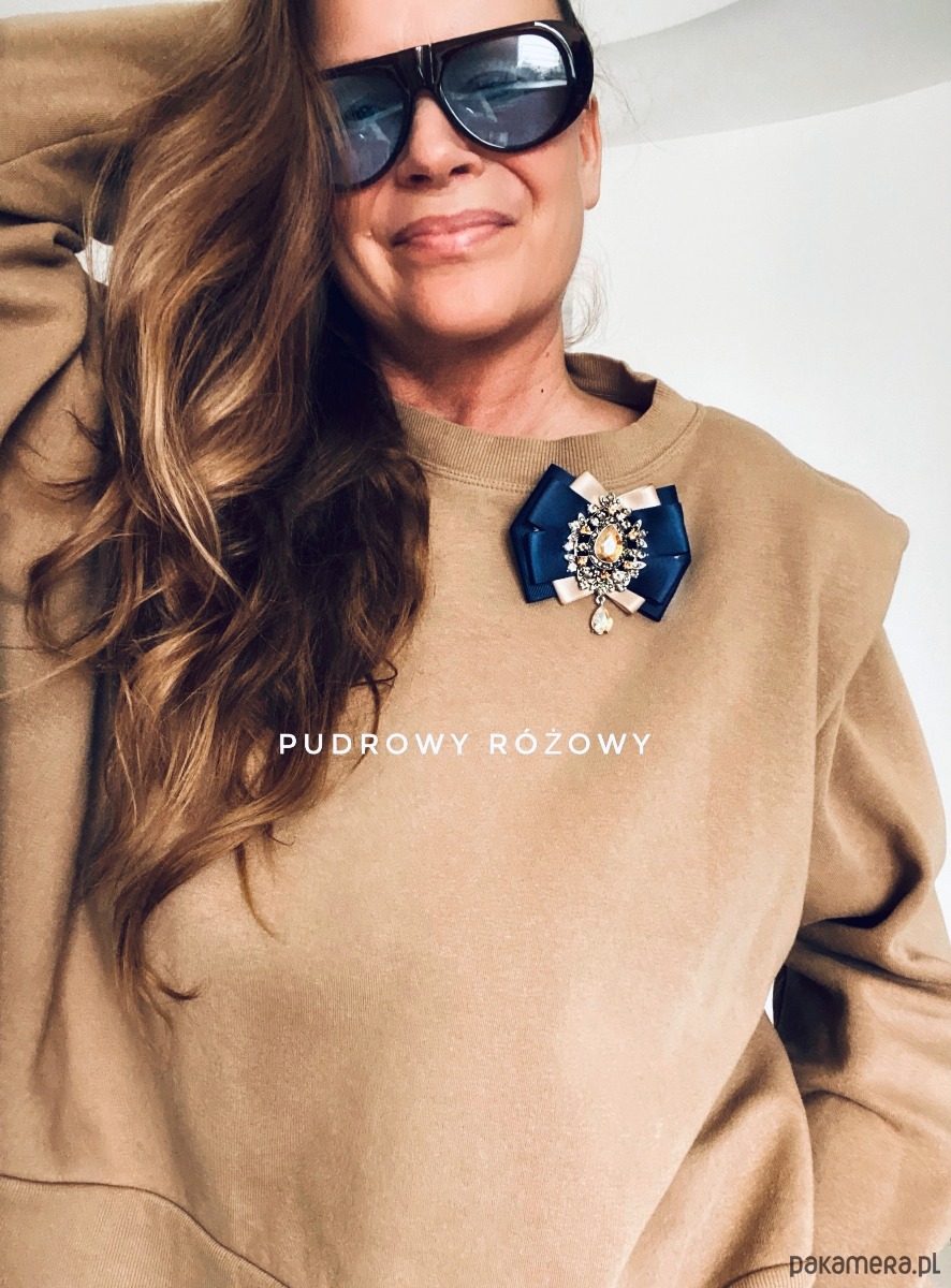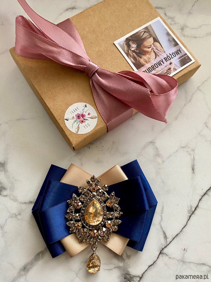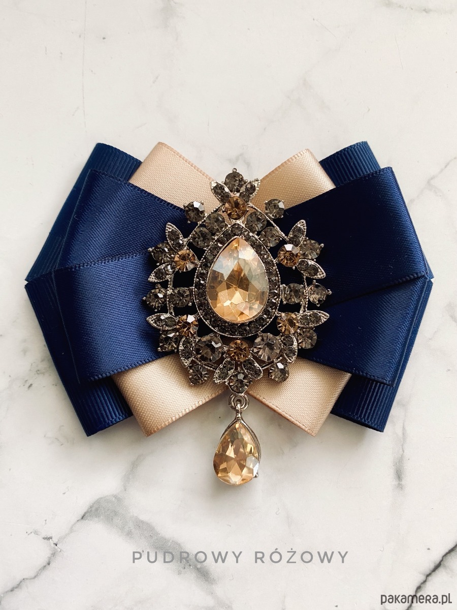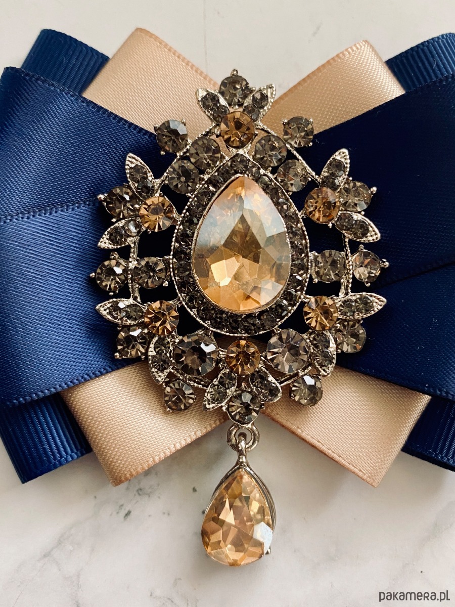 Broszka wykonana z wysokiej jakości taśm i dodatków. Brosza w kolorze szlachetnego beżu i klasycznego granatu. Na środku imponująca ażurowa ozdoba biżuteryjna z kryształami w kolorze szampanskim. Brosza stworzona z myślą o kobietach delikatnych o klasycznej urodzie. Będzie idealnie pasować zarówno do koszul, bluzek, swetrów, sukienek, żakietów oraz do płaszczy, kurtek, szali i chust. Idealna do każdej stylizacji, zarówno do sportowej jak również do eleganckich stylizacji.