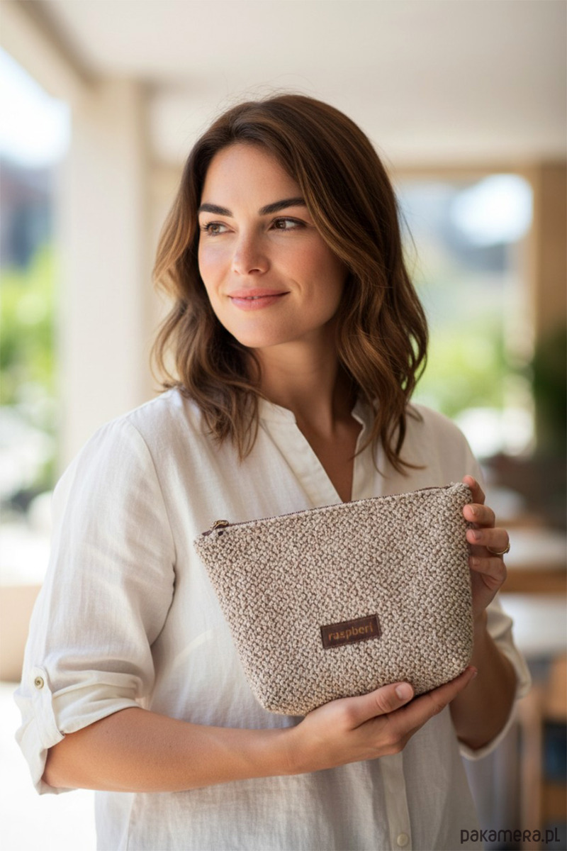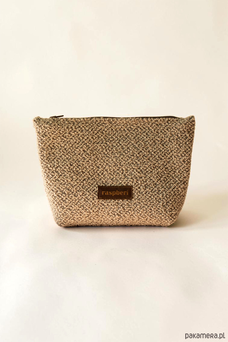 Duża kosmetyczka w kolorze beżowym. Wykonana z bardzo miłej w dotyku tkaniny.