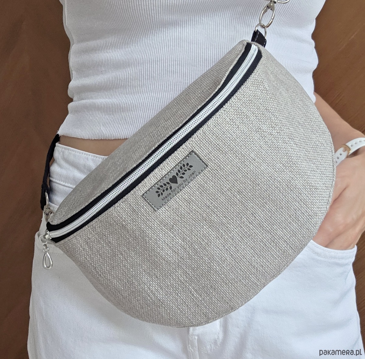 Nerka, saszetka do noszenia na ramię z regulowanym paskiem, zapinana na suwak, w środku mała kieszonka na suwak.