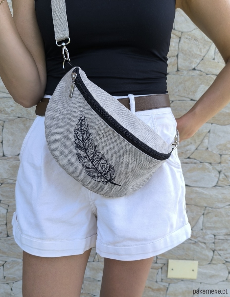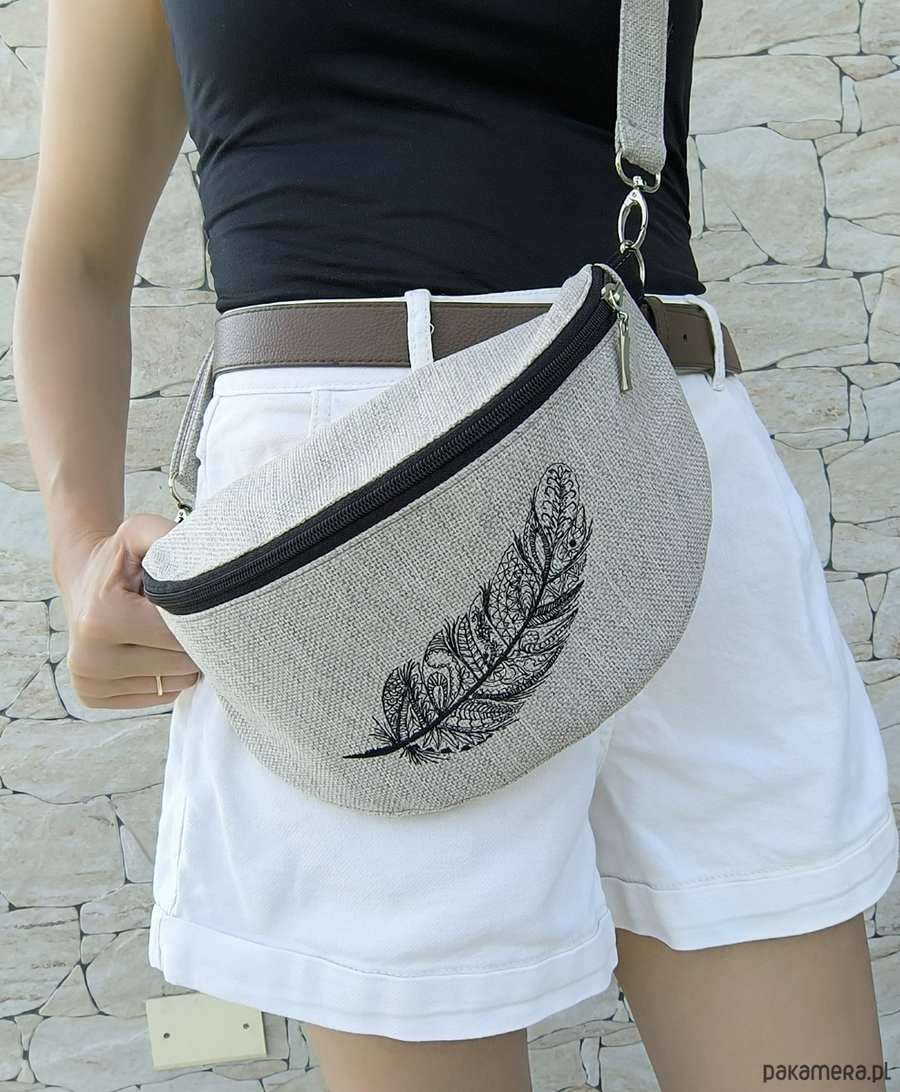 Beżowa nerka z piórkiem na ramię pleciony materiał