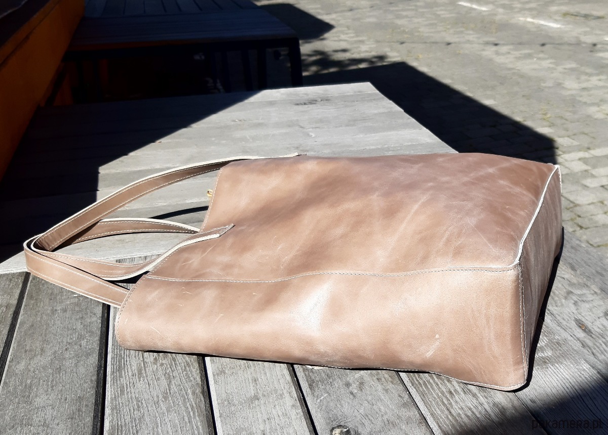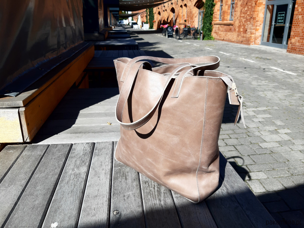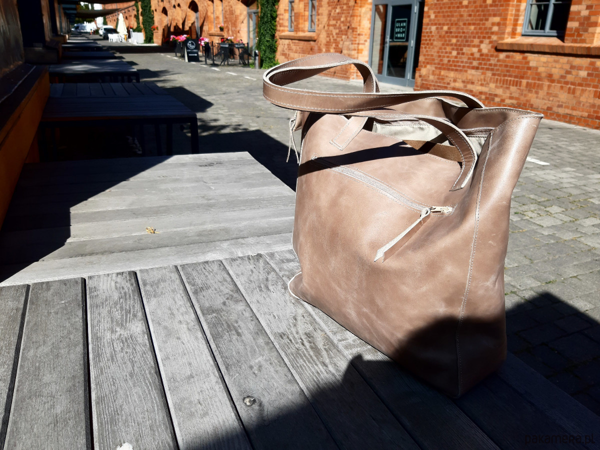 Duża skórzana torba. Uszyta z grubszej skóry naturalnej w kolorze beżowym, odcień chłodny. To jest taka mieszanka beżu, z kroplą szarego, a gdzieś z daleka macha do nich róż, ale naprawdę z daleka.