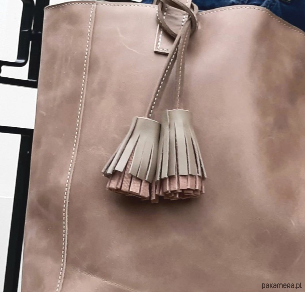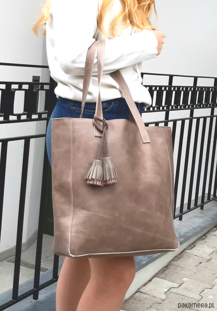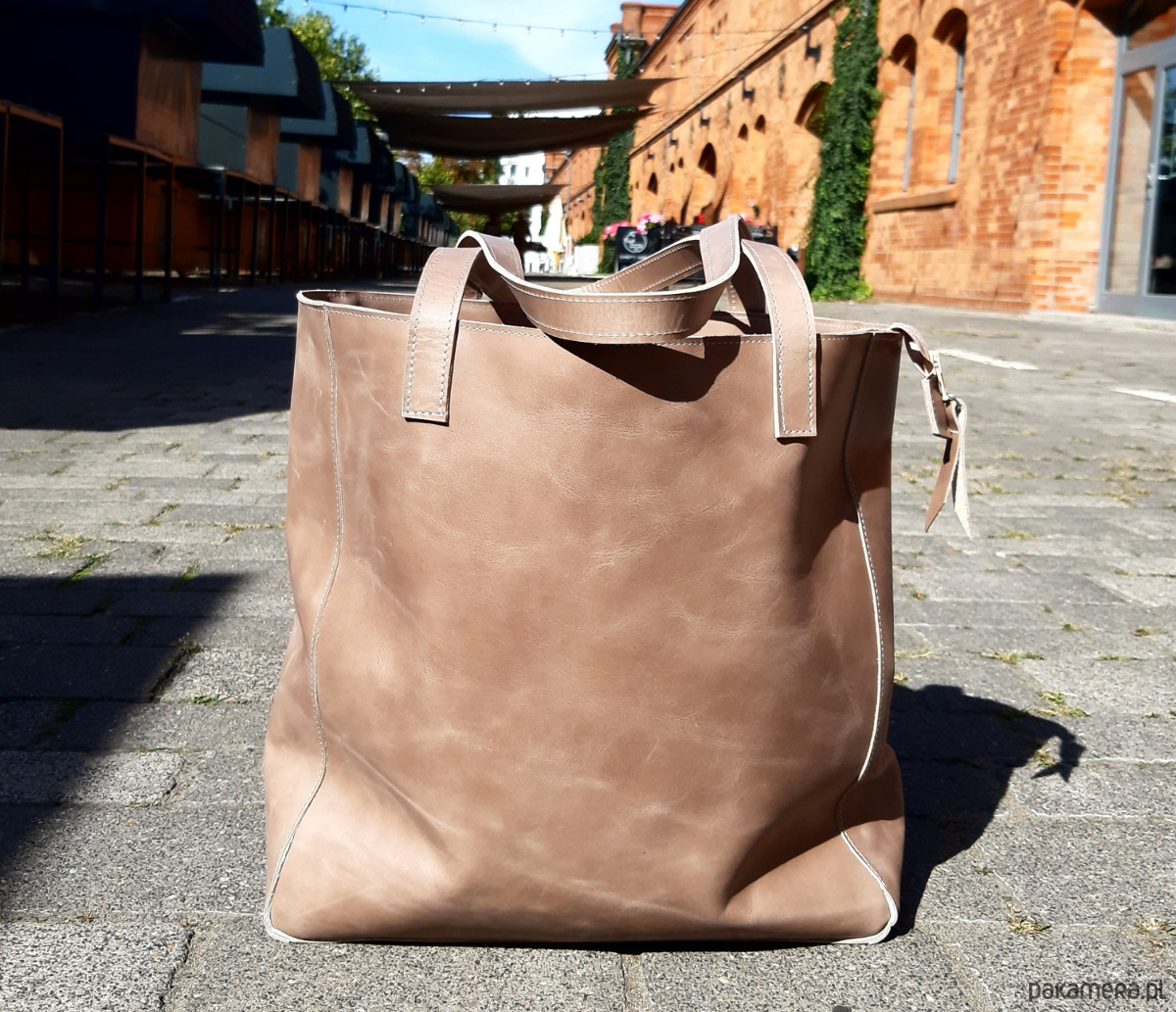 Duża skórzana torba. Uszyta z grubszej skóry naturalnej w kolorze beżowym, odcień chłodny. To jest taka mieszanka beżu, z kroplą szarego, a gdzieś z daleka macha do nich róż, ale naprawdę z daleka.